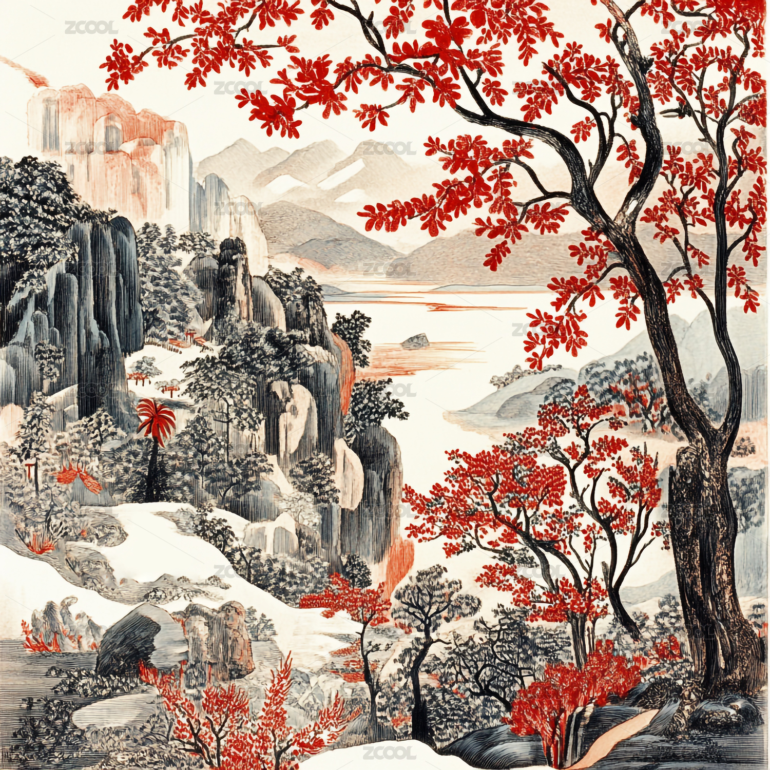剪纸,复古,红色,红叶,枫叶,松树,植物,植被,亭台,楼阁