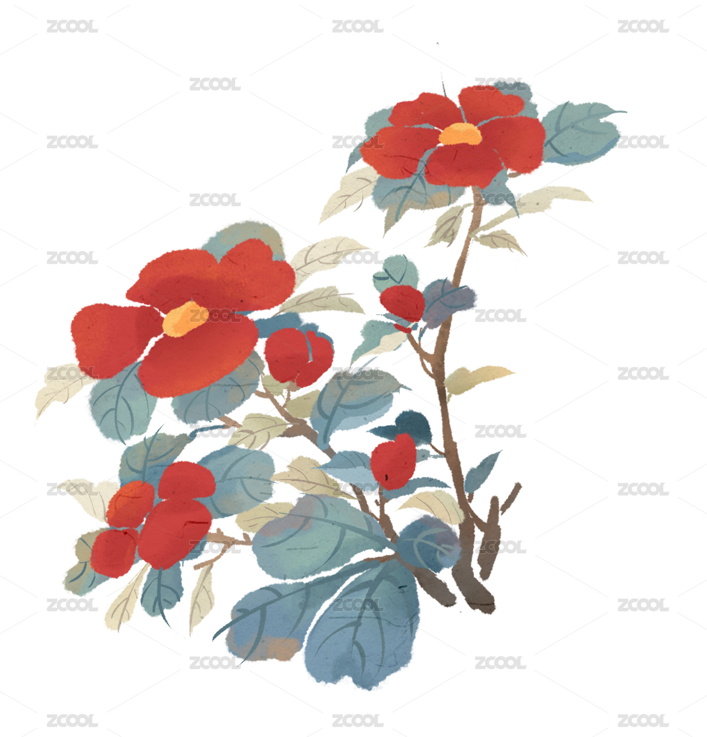 山茶花红花植物国画水彩工笔
