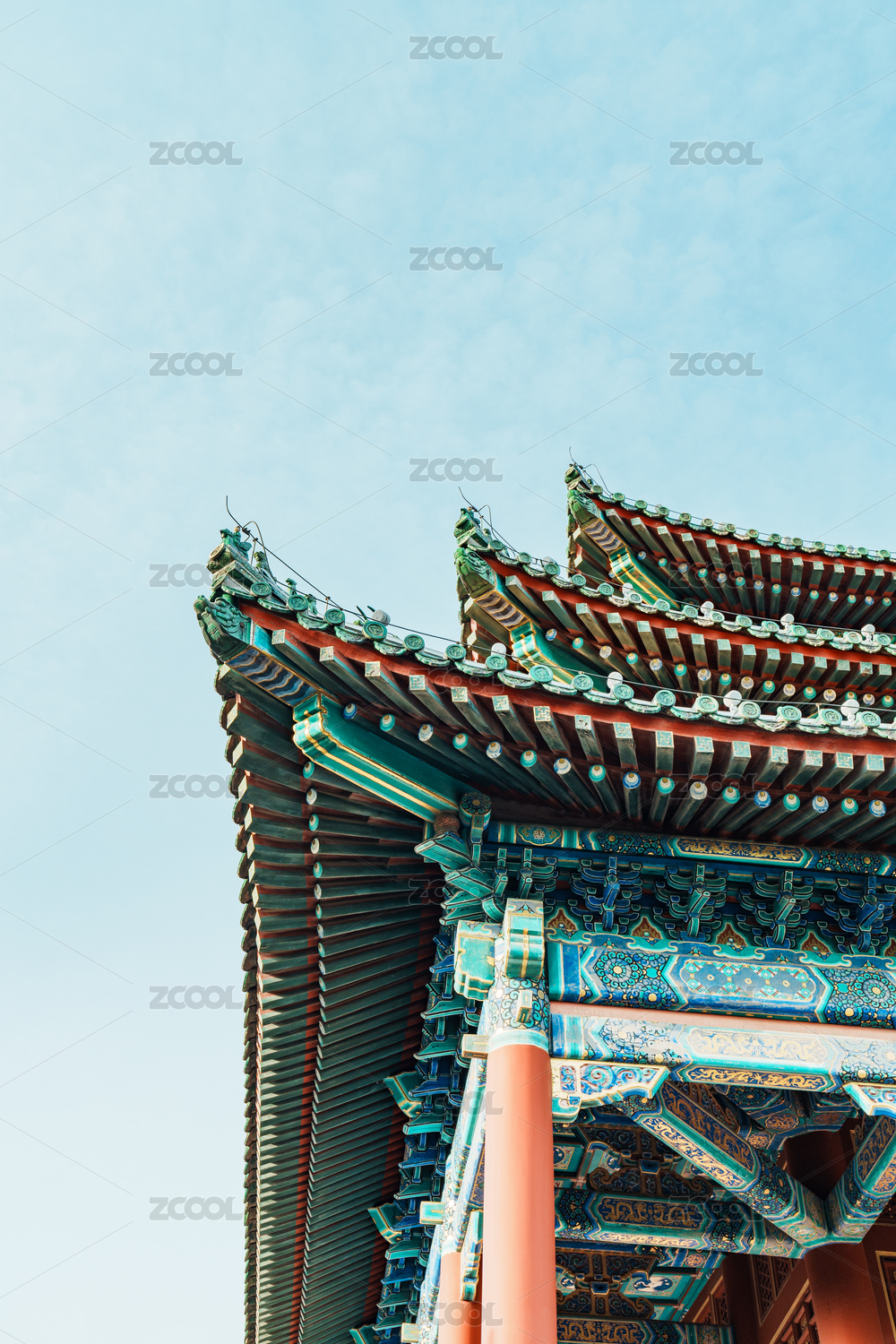 历史建筑房檐斗拱彩绘天空背景暮色灯光