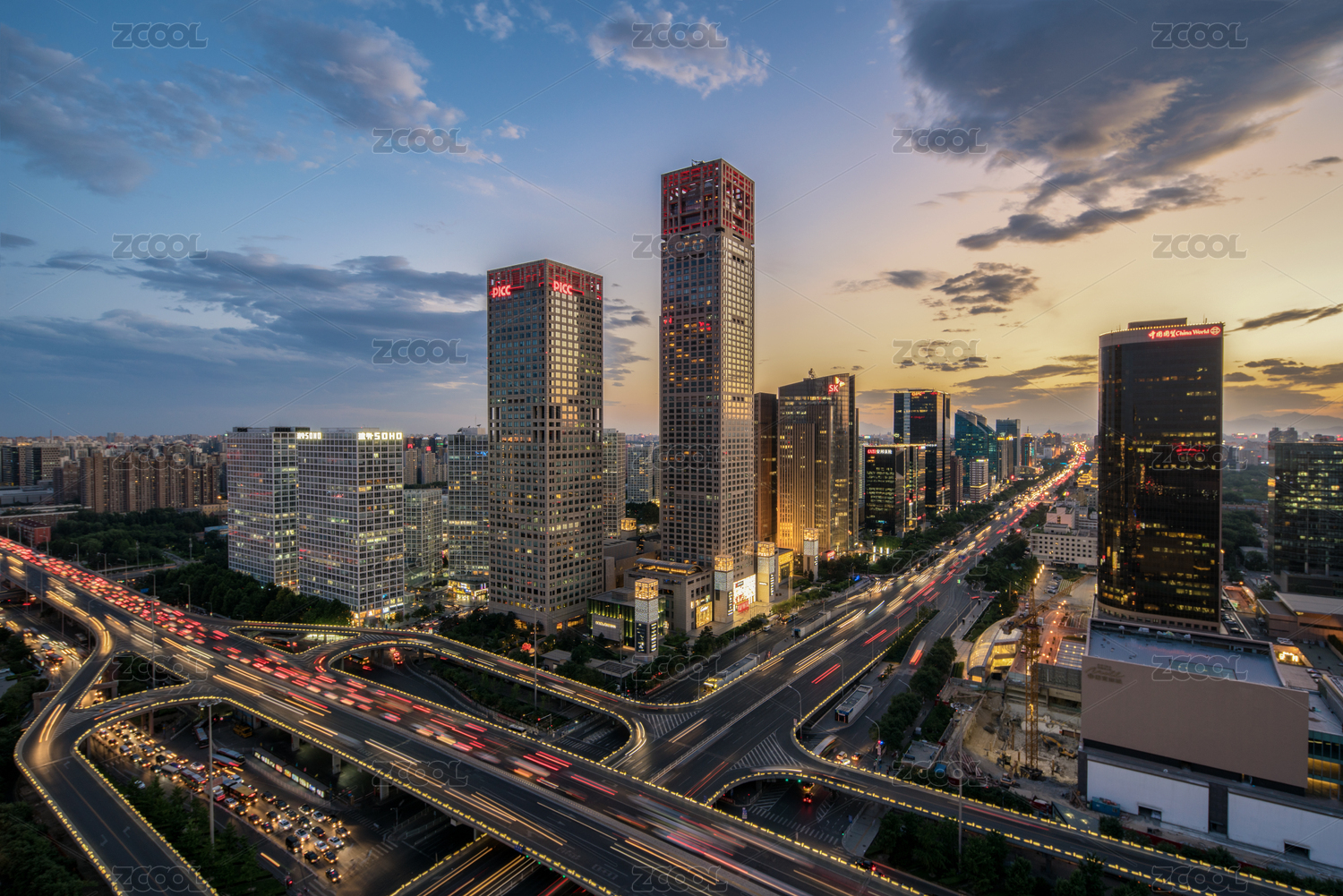 中国北京国贸立交桥和CBD建筑群高视角夜