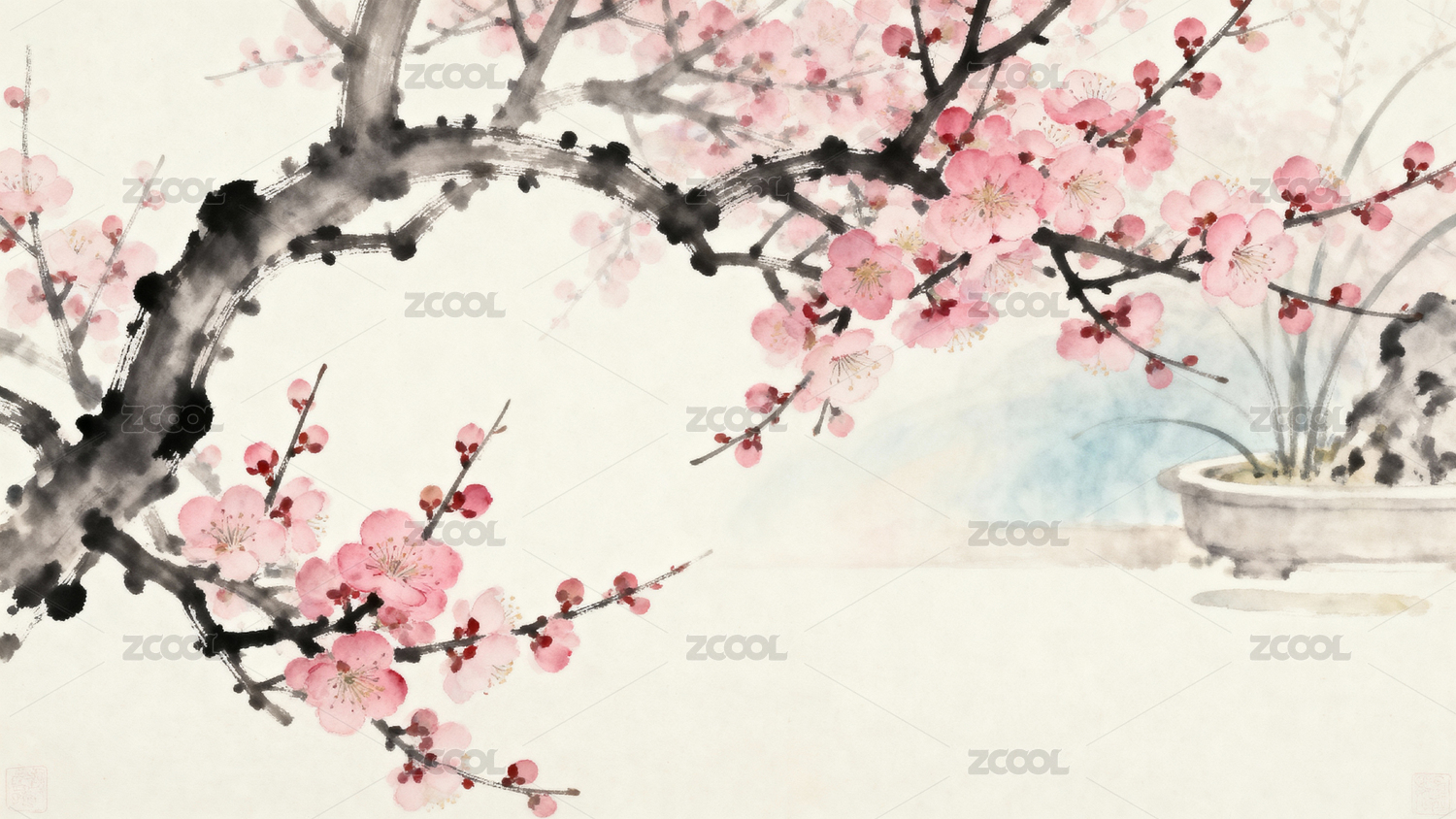 意境,中国风,水墨画,山水画,写意,留白,梅花,亭子,安静,宁静