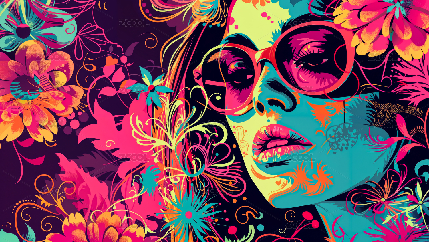 墨镜,梦幻,迷幻,鲜艳,色彩,花朵,面部,脸孔,女性,嘴唇
