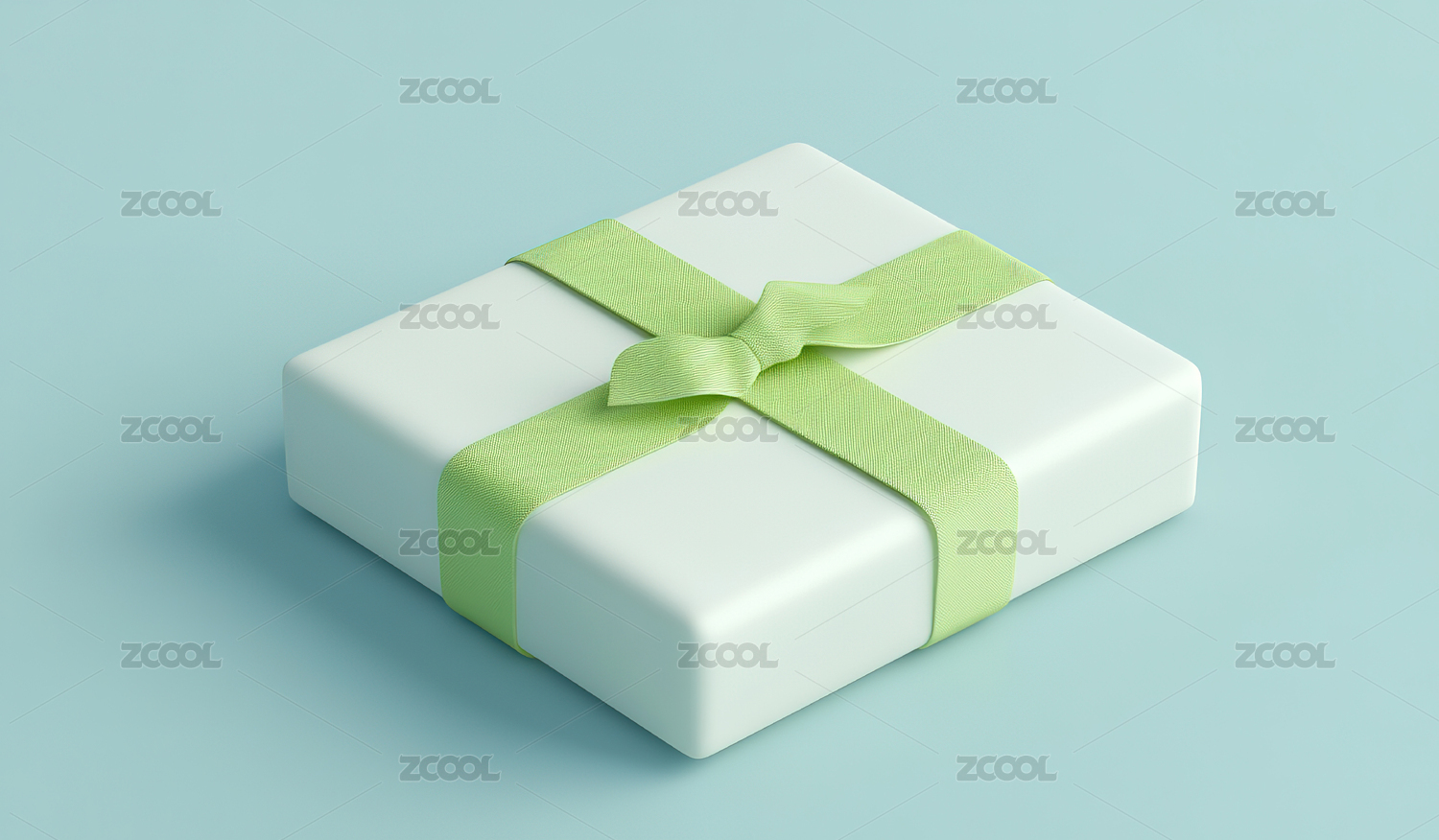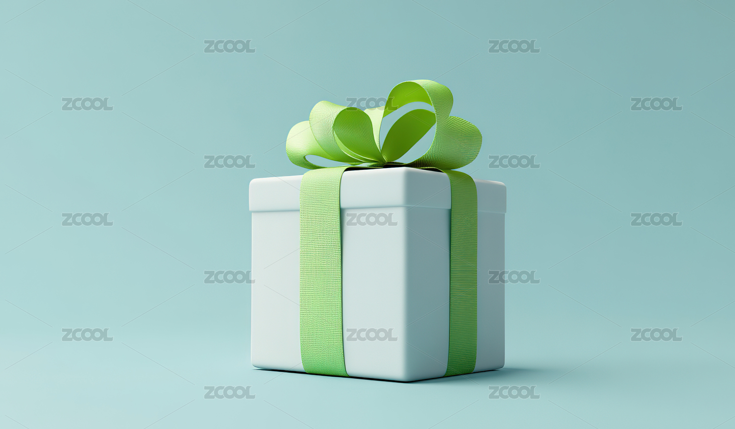 带有绿色蝴蝶结绿色礼品盒特写图片
