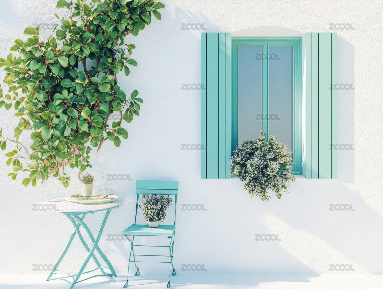 中国新疆伊宁哈萨克族村落,白色的窗户,蓝色的墙壁,绿色的植物