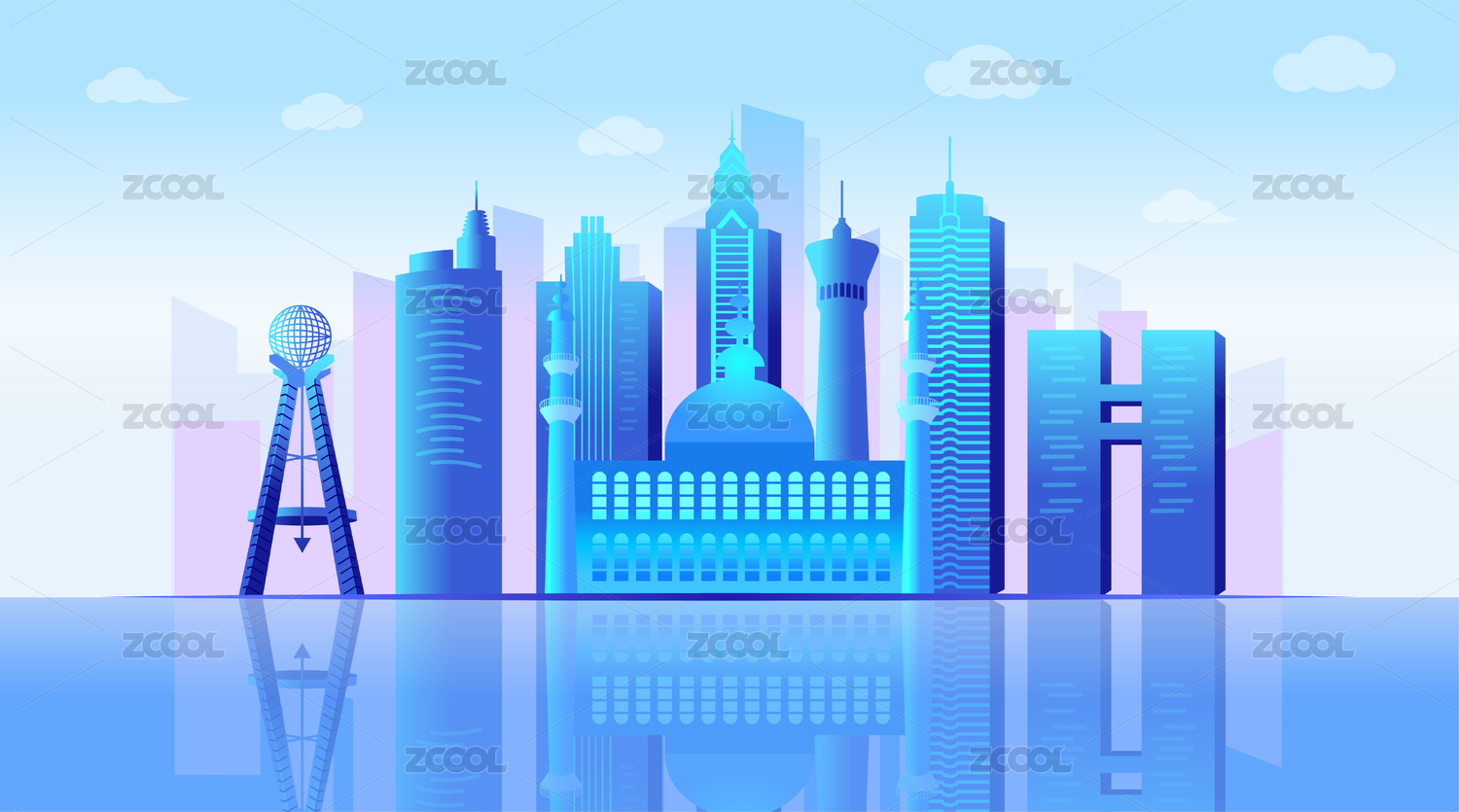 中国新疆乌鲁木齐市商务科技城市彩色插画