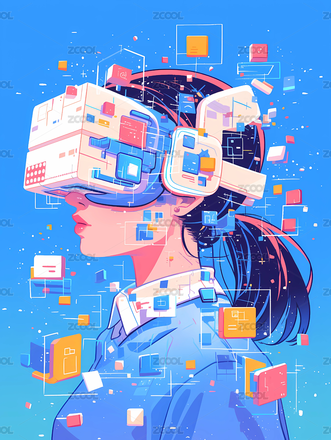 女性,穿戴,VR眼镜,眼镜,数据,包围,大数据,衬衫,小方块,几何形状