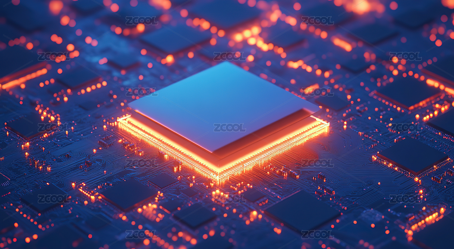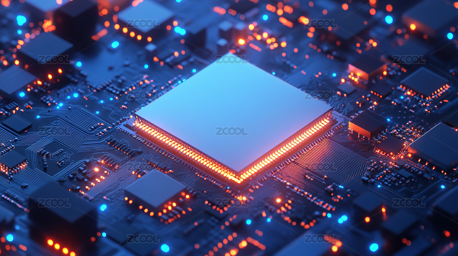 3D立体电路板上的蓝色方块芯片