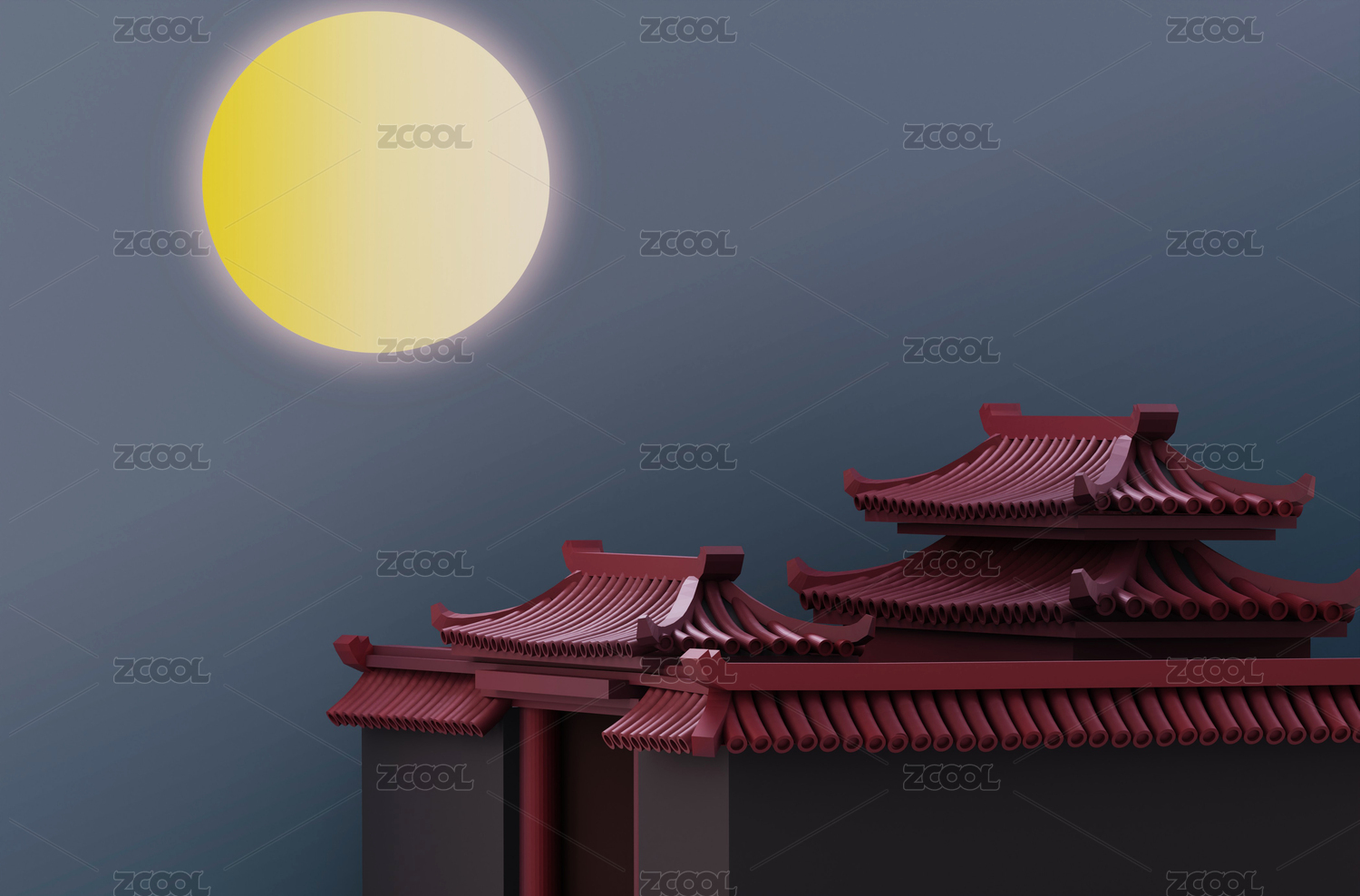 3D渲染国潮中秋节古代建筑祝中秋快乐
