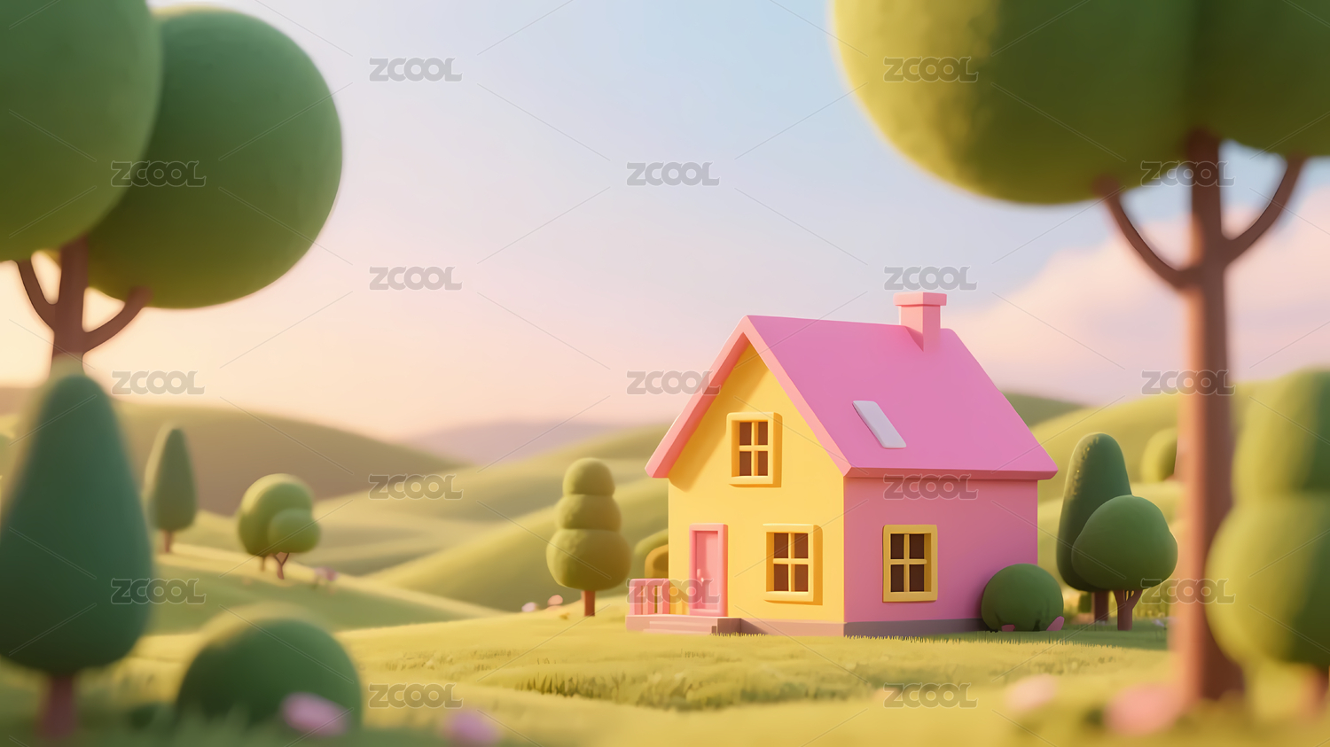 粉红屋顶小屋绿树草地