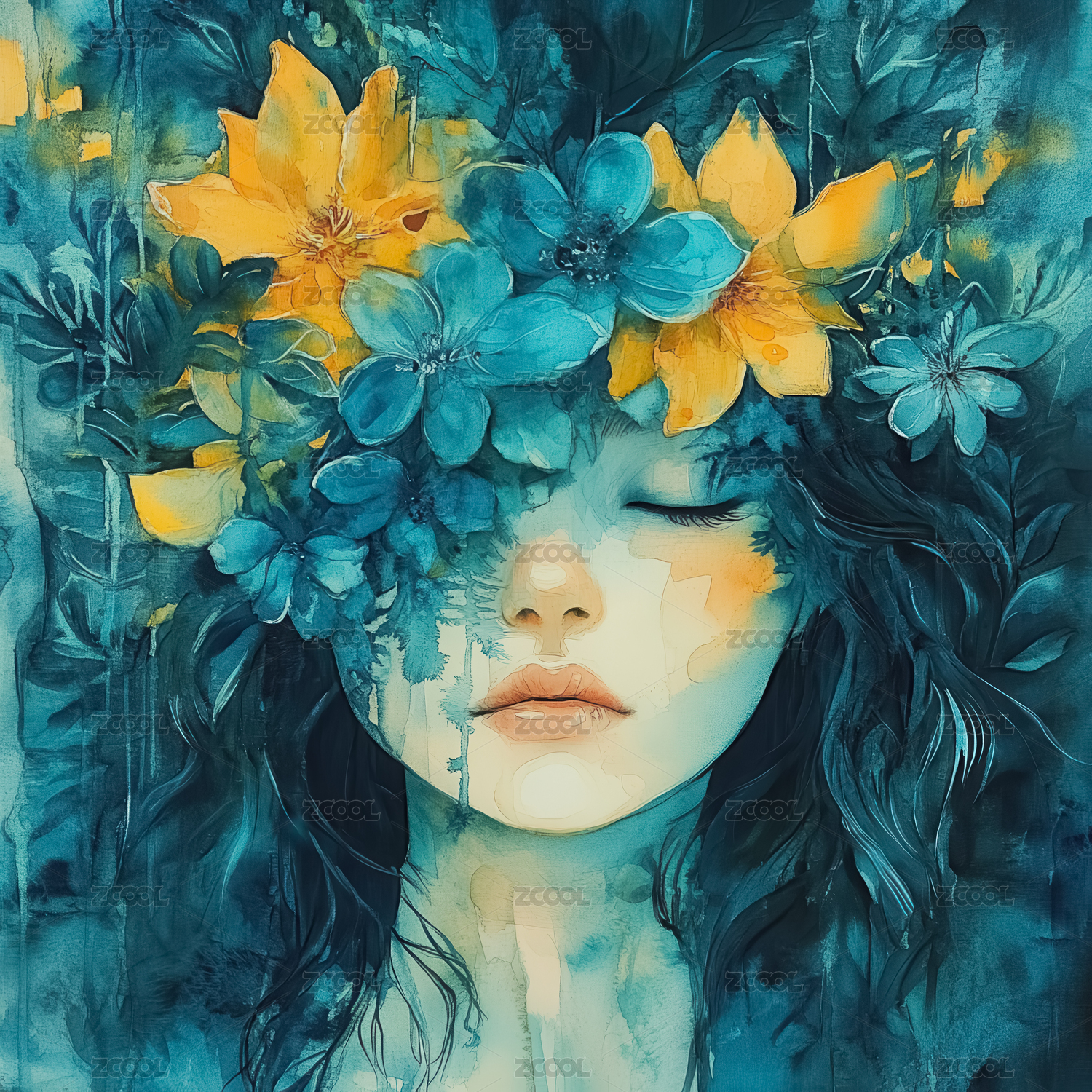 一个头发上戴着花的女人彩色插画