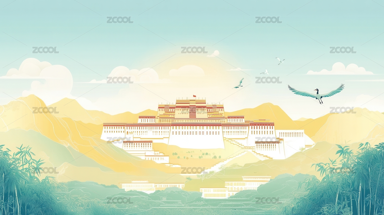 热门城市拉萨罗布林卡旅游景点插画明信片