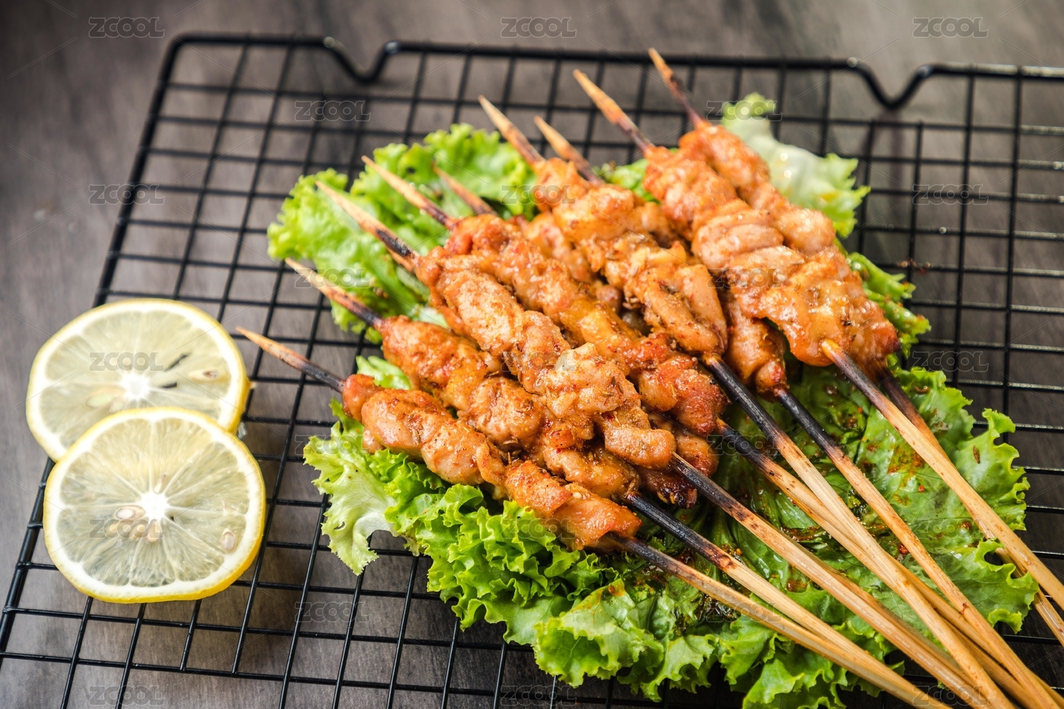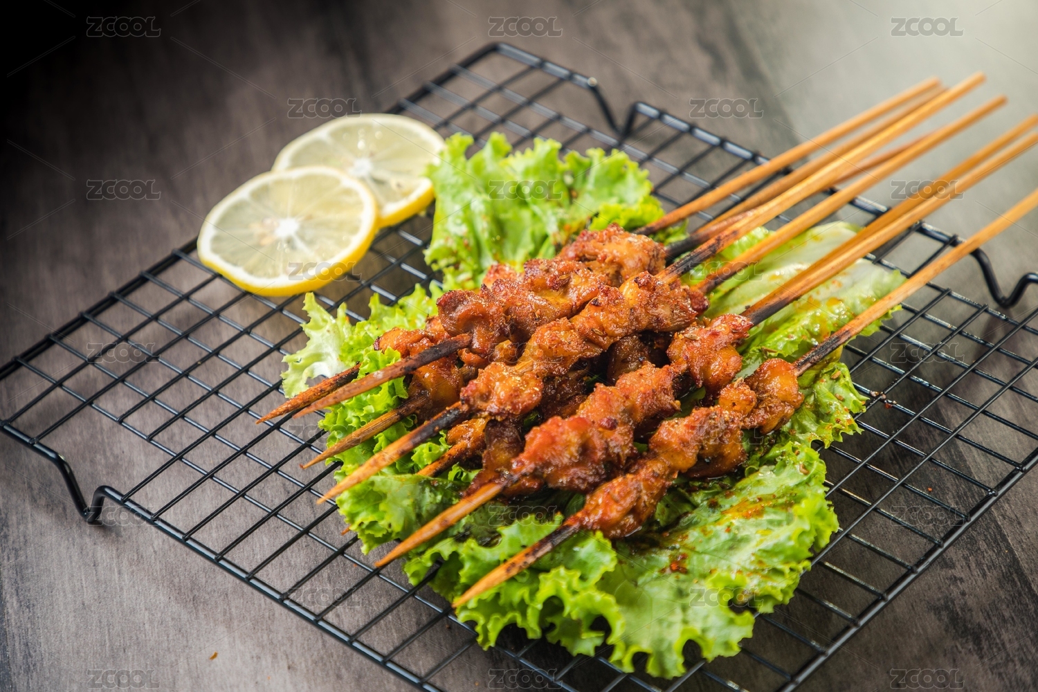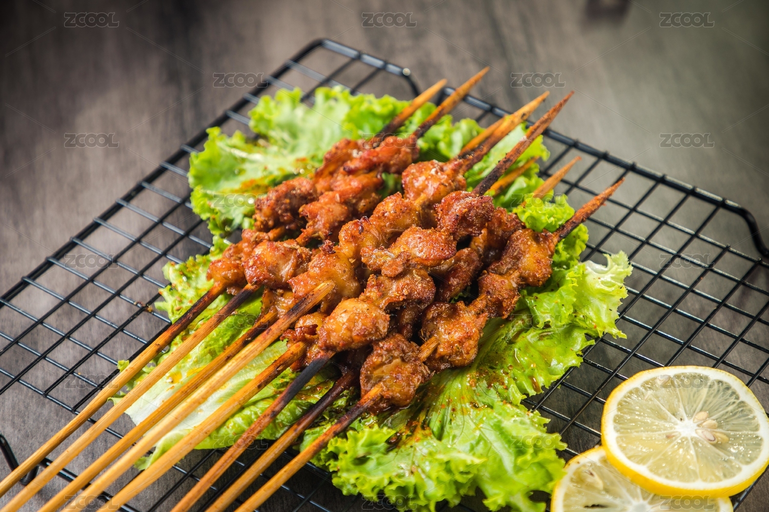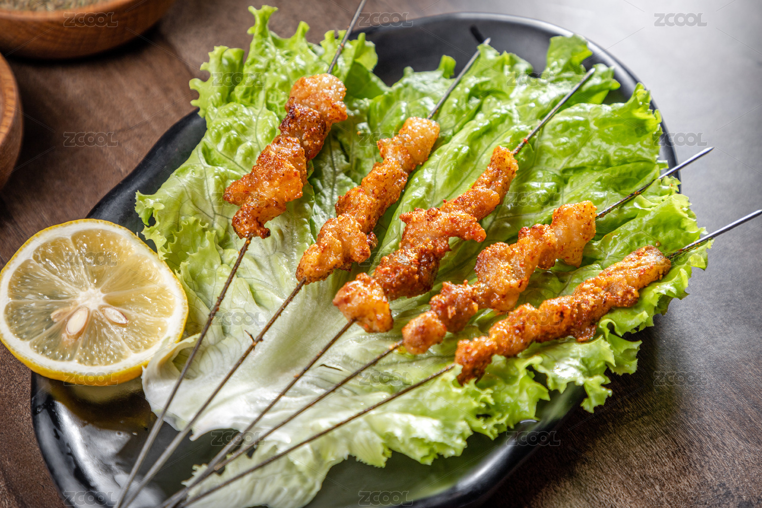 黑色盘子,生菜叶,暗色调,烧烤,炒菜,料理,柠檬片,牛胸口肉,串,烤串