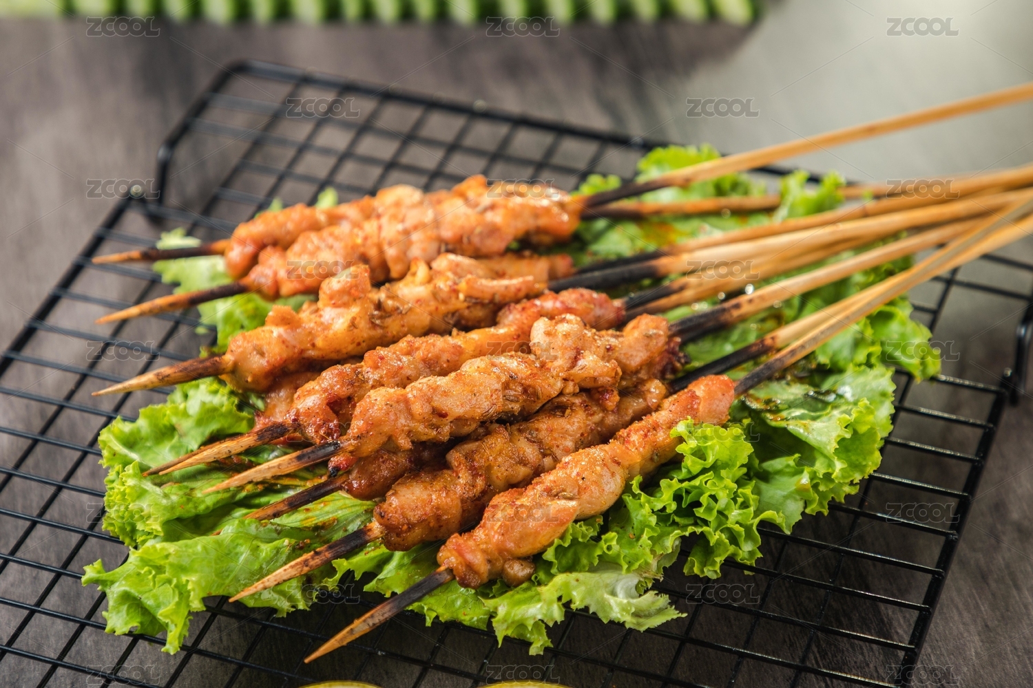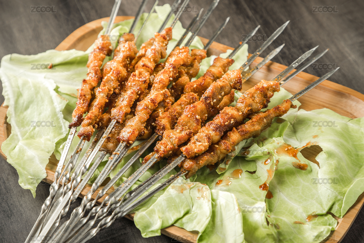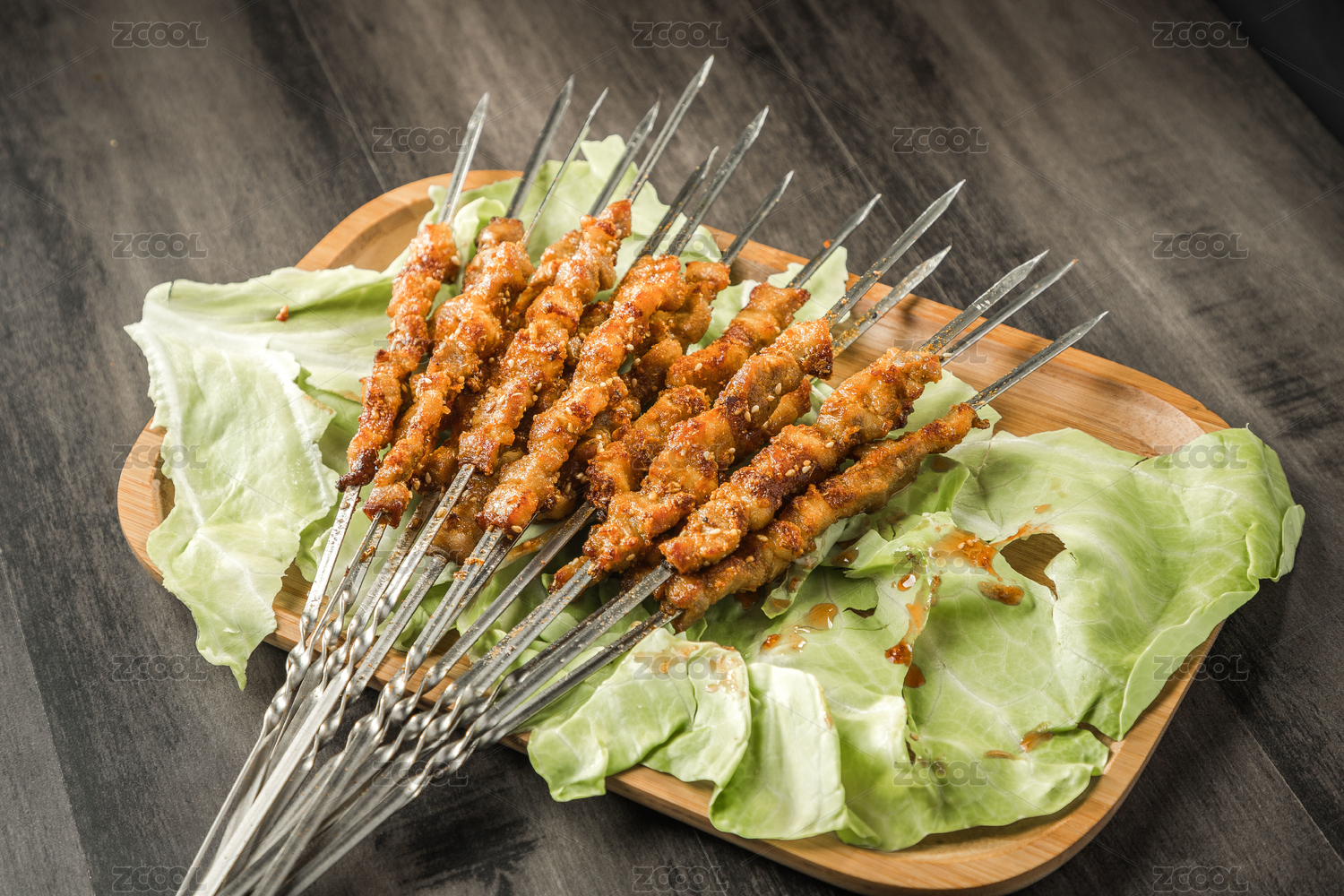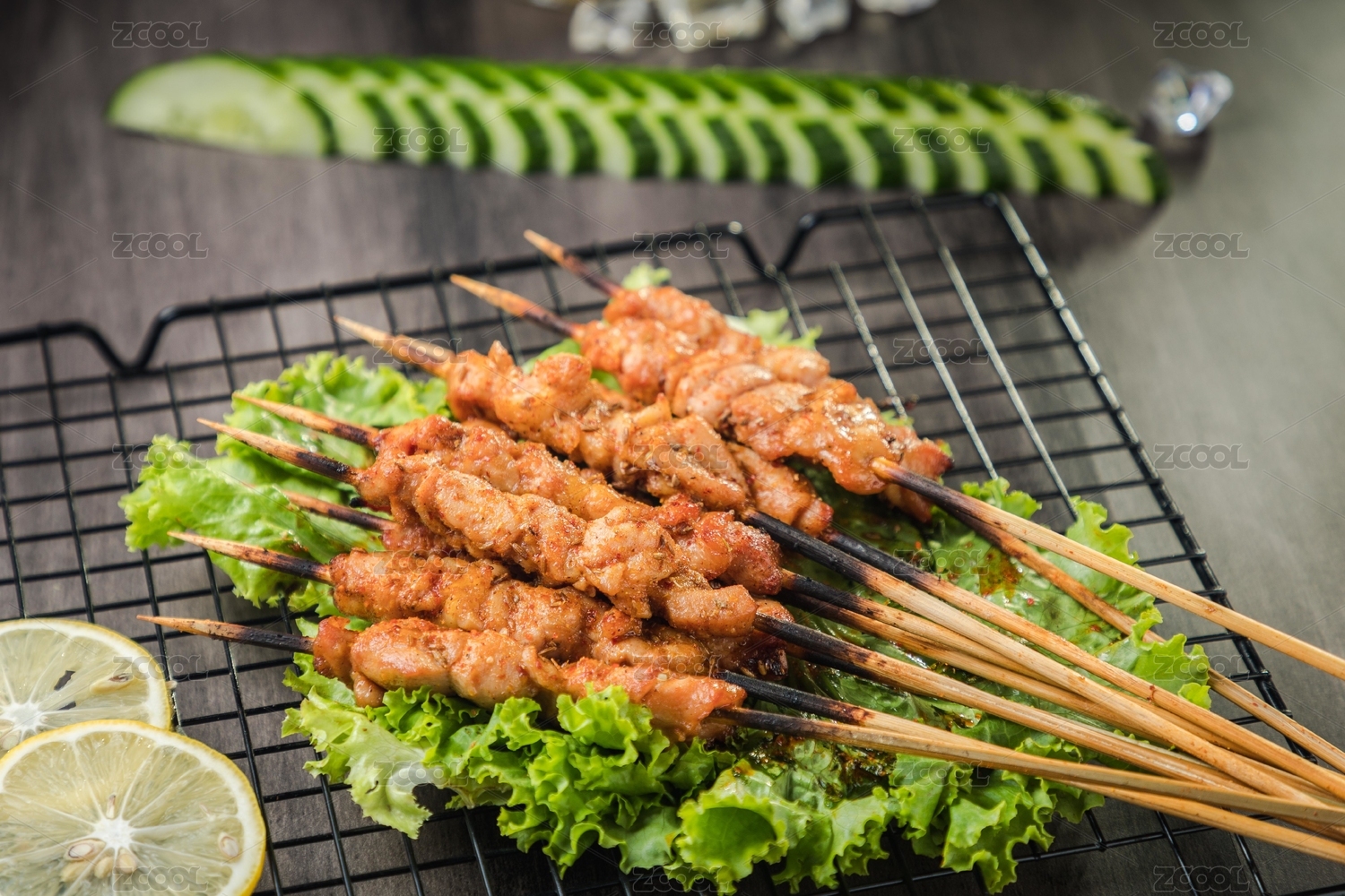 黑色盘子,生菜叶,暗色调,烧烤,炒菜,料理,柠檬片,牛胸口肉,串,烤串