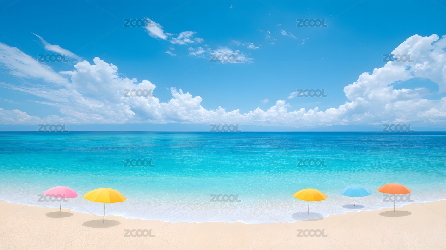 蓝天白云下沙滩上放着沙滩椅和遮阳伞