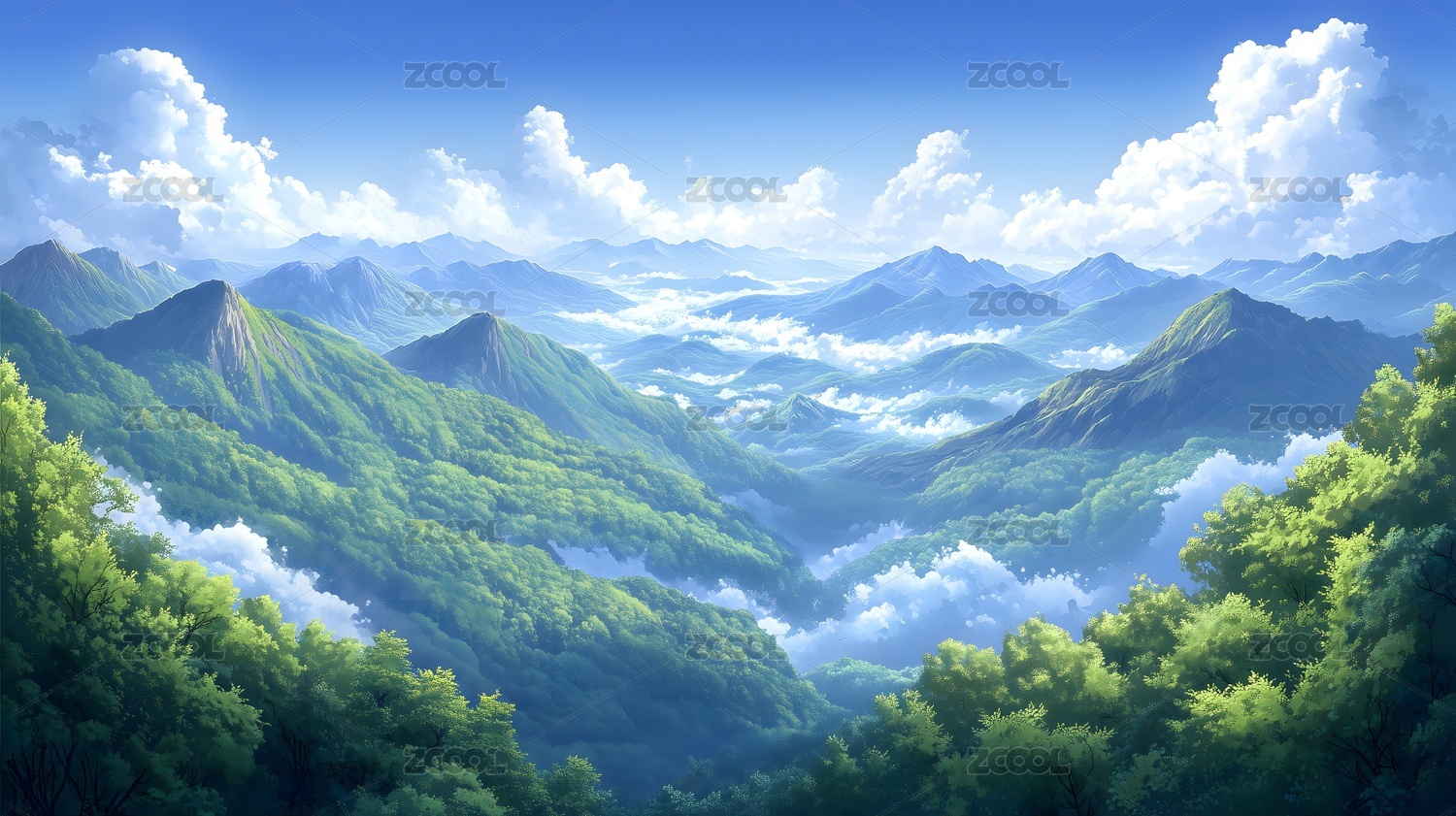 青翠山谷与蓝天白云