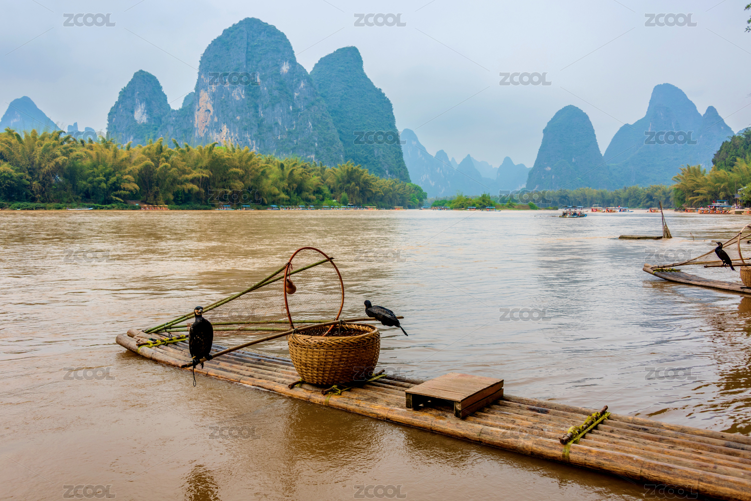 中国广西桂林阳朔兴坪漓江边的竹筏鸬鹚