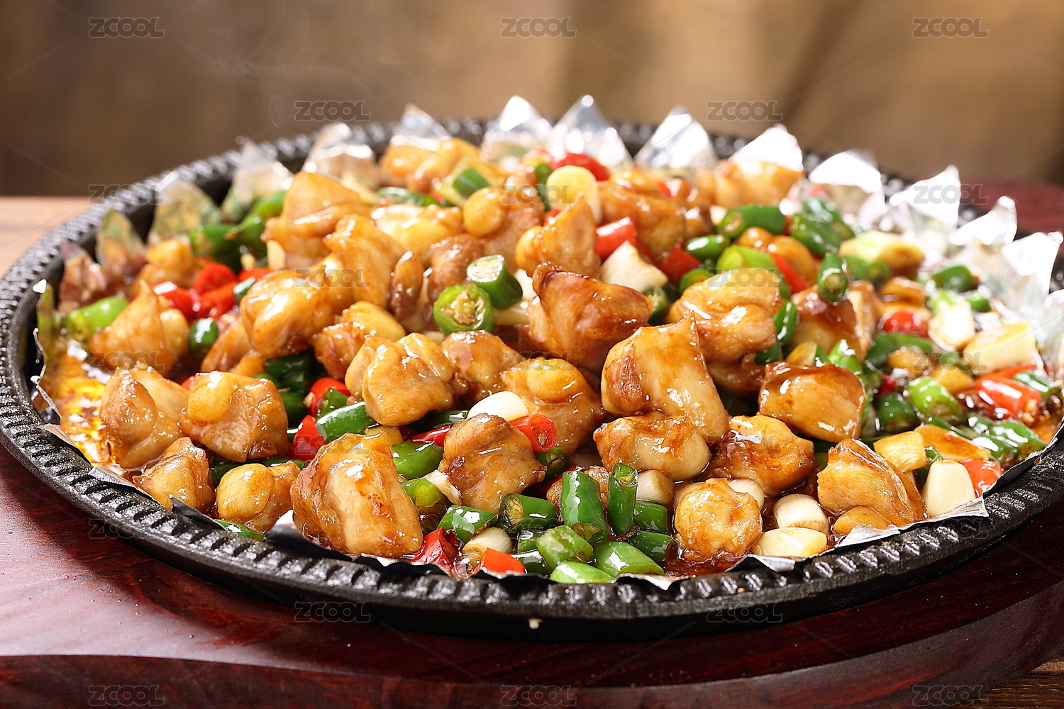 黑色盘子上锡铂纸上的尖椒鸡