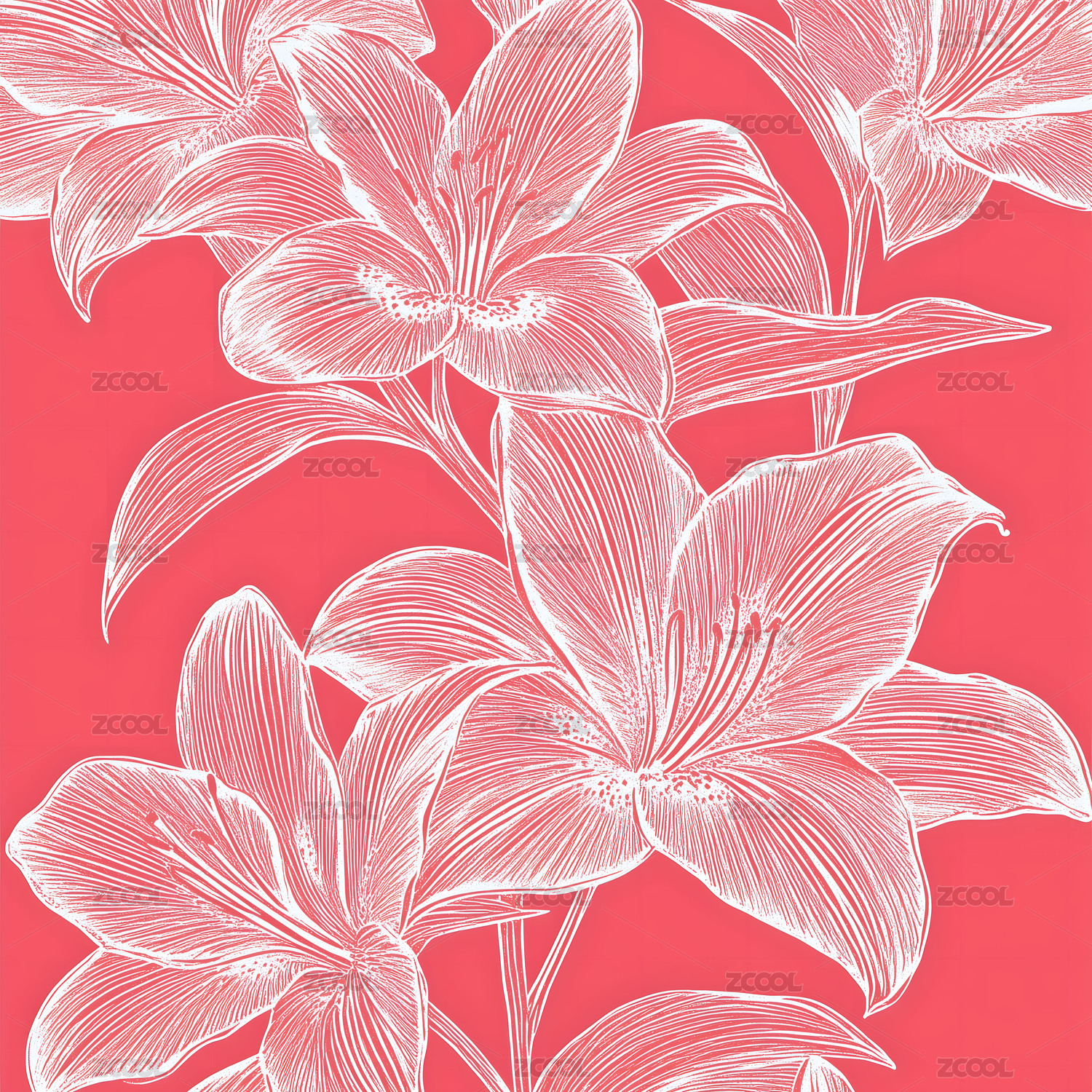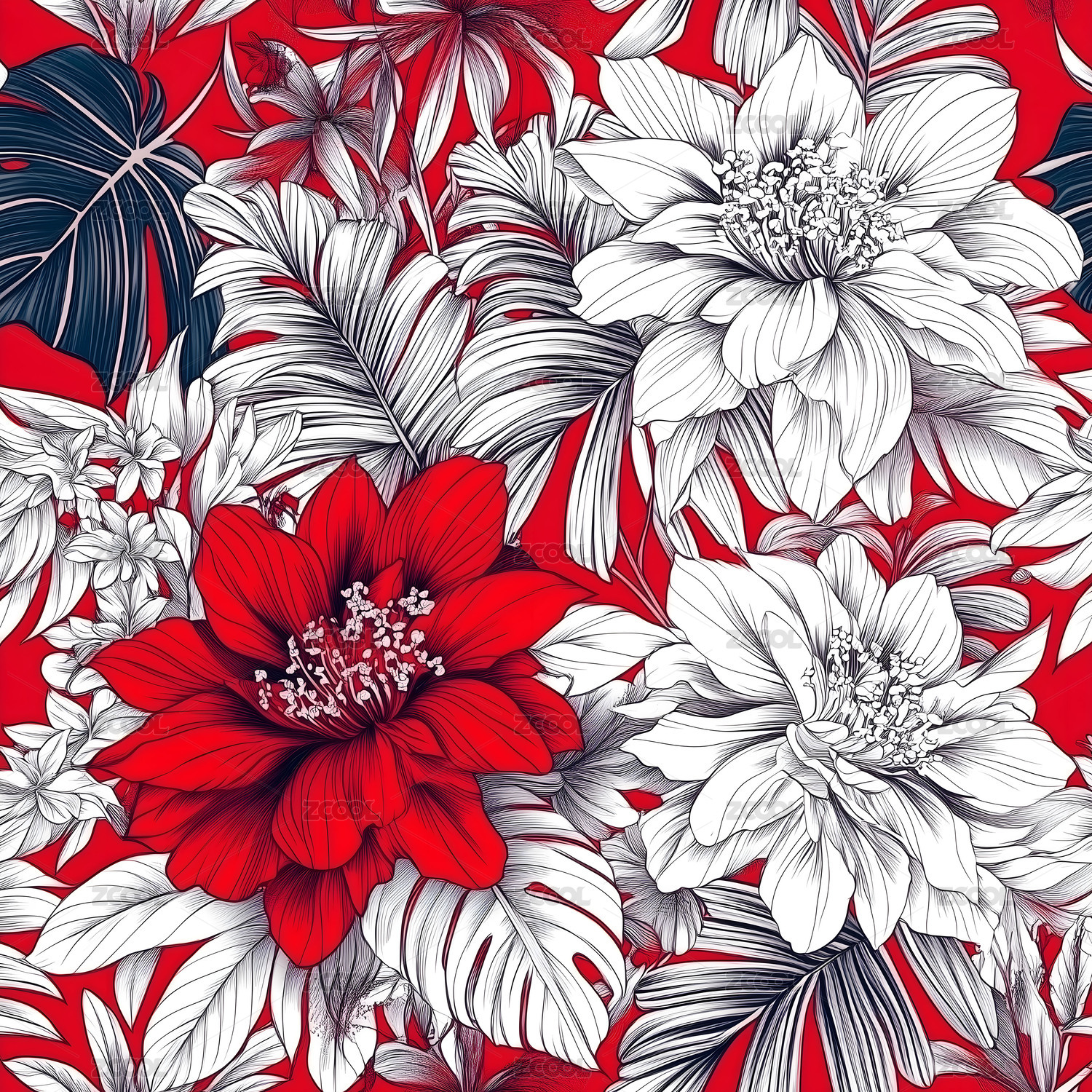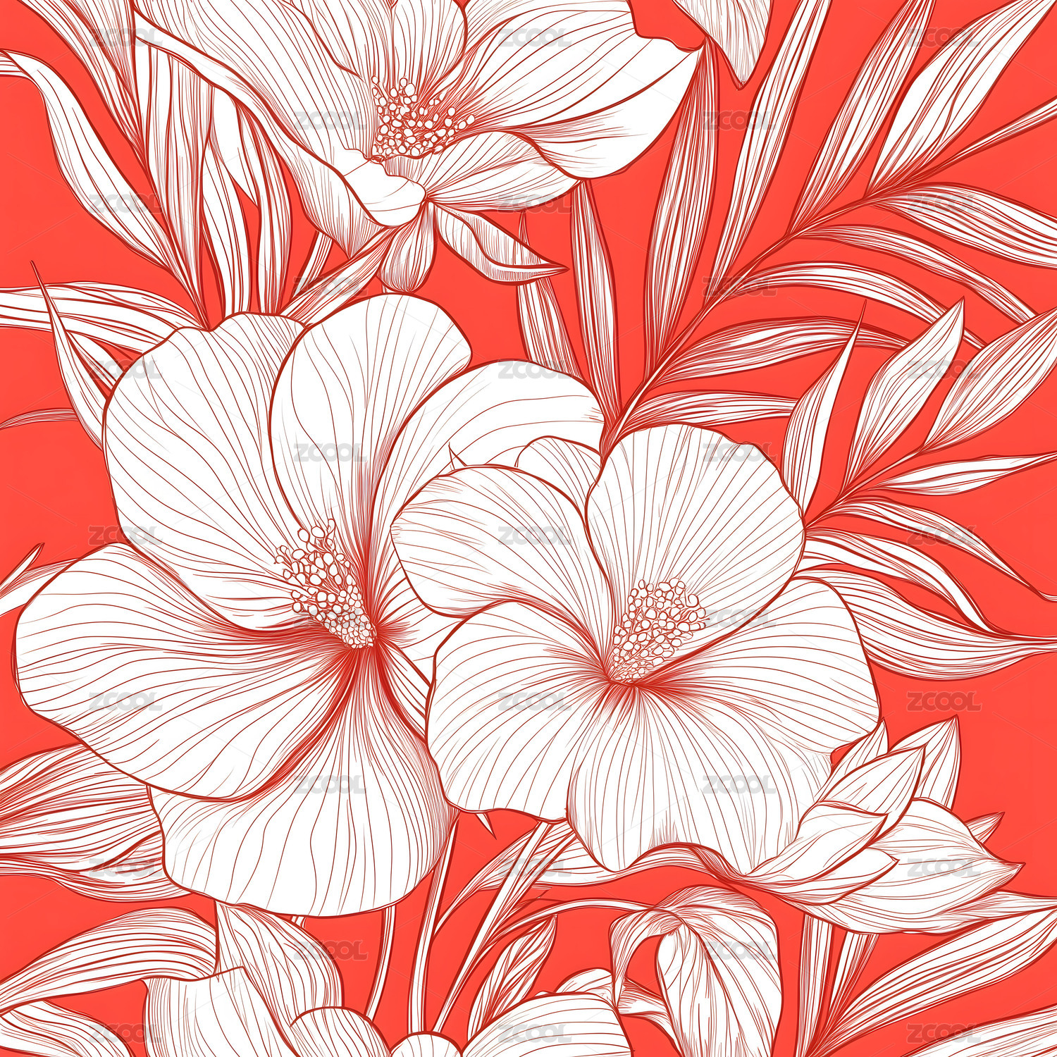 红色背景热带花卉图案。郁郁葱葱的叶子花卉
