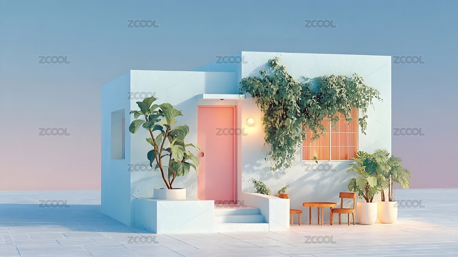 粉色小屋与雪山仙人掌的梦幻邂逅