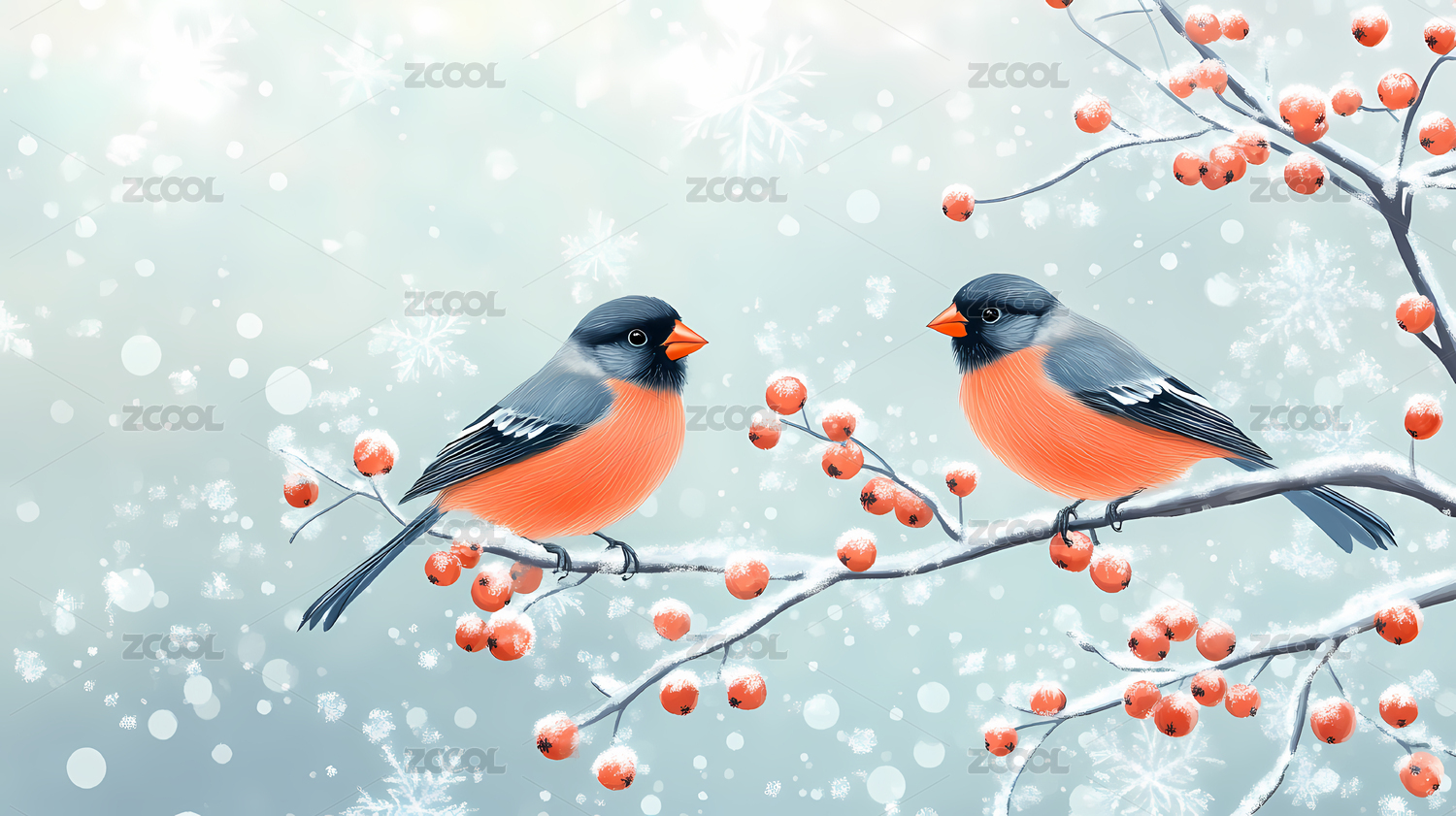 小燕子,柿子树,冬季,瑞雪,中国风,插画