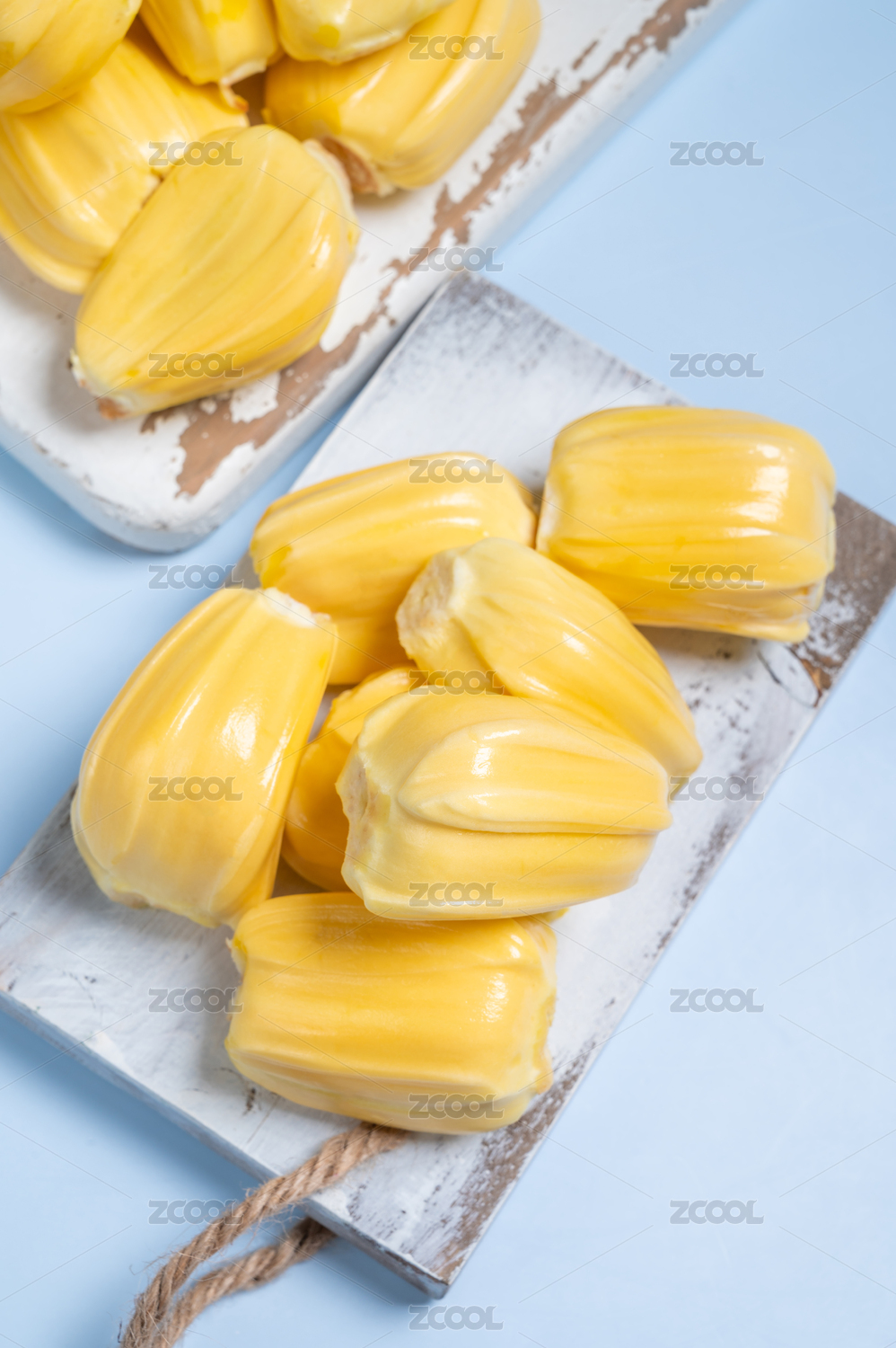 木纹背景上摆放着金黄色的菠萝蜜果肉