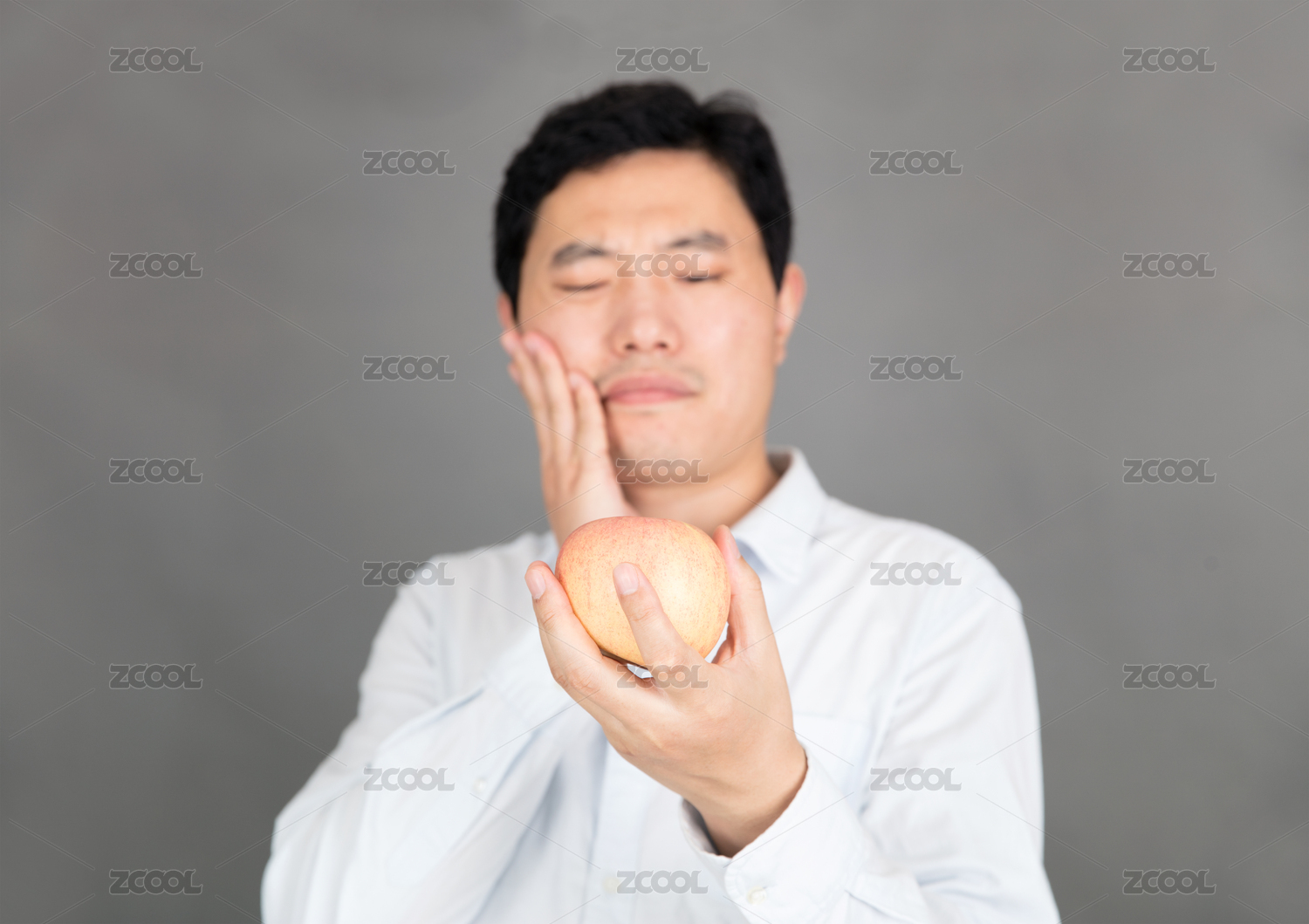 牙疼的男士望着一个想吃的苹果