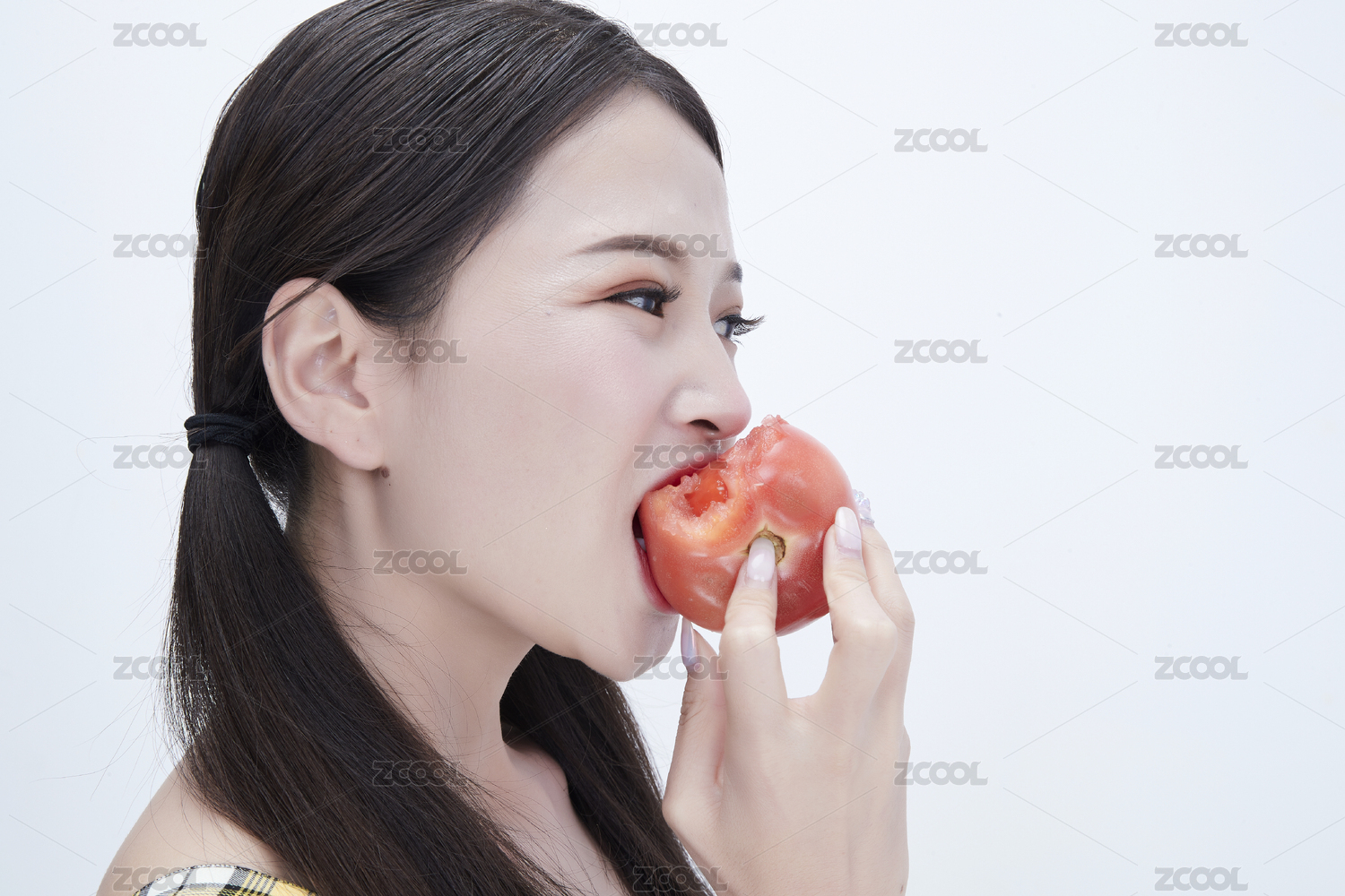 啃咬番茄身穿格子吊带裙的亚洲可爱少女人像