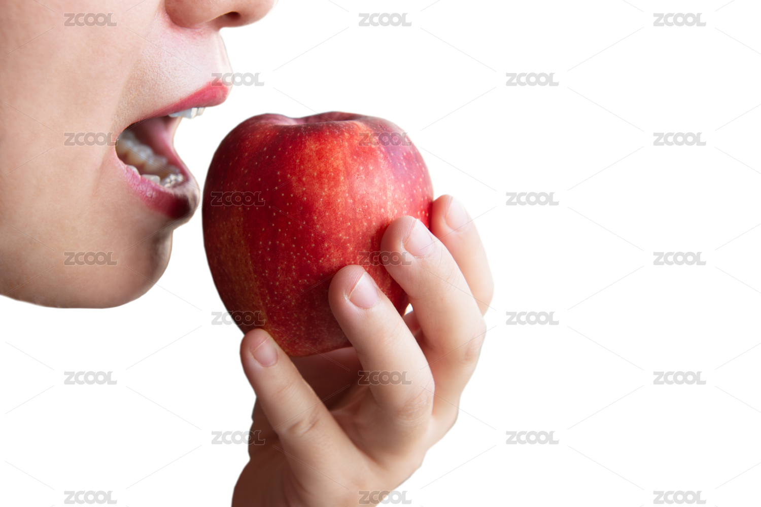 白色背景上一个女人准备吃一个红色的苹果