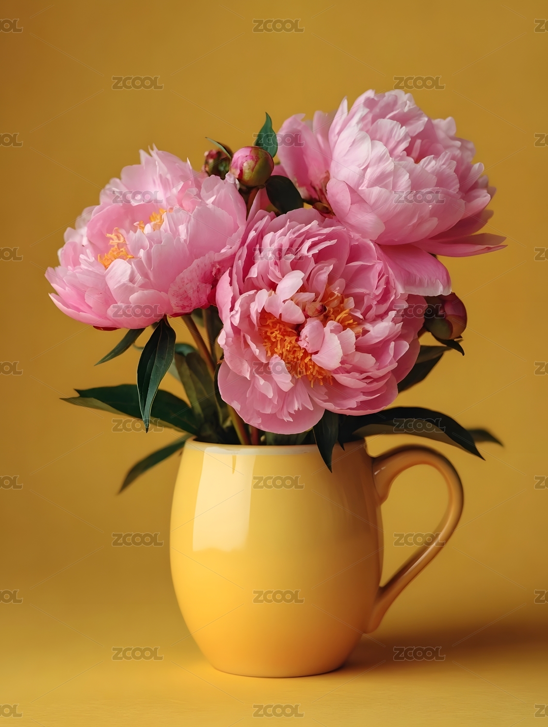 放在白色搪瓷杯里的盛开的芍药鲜花