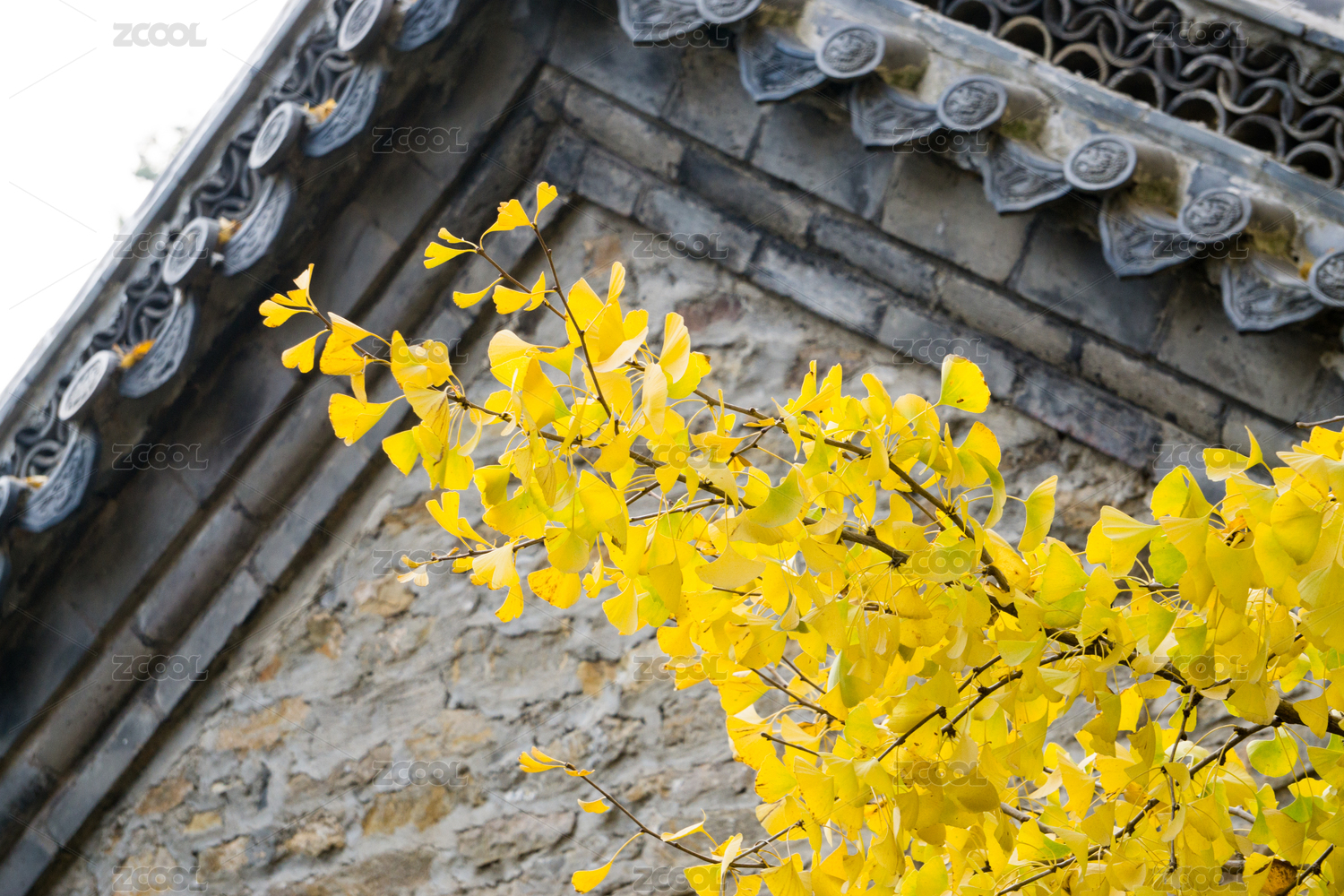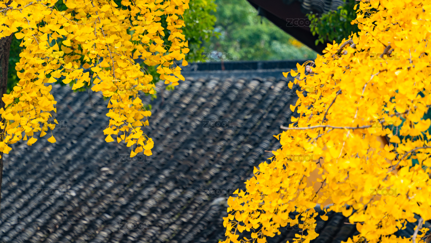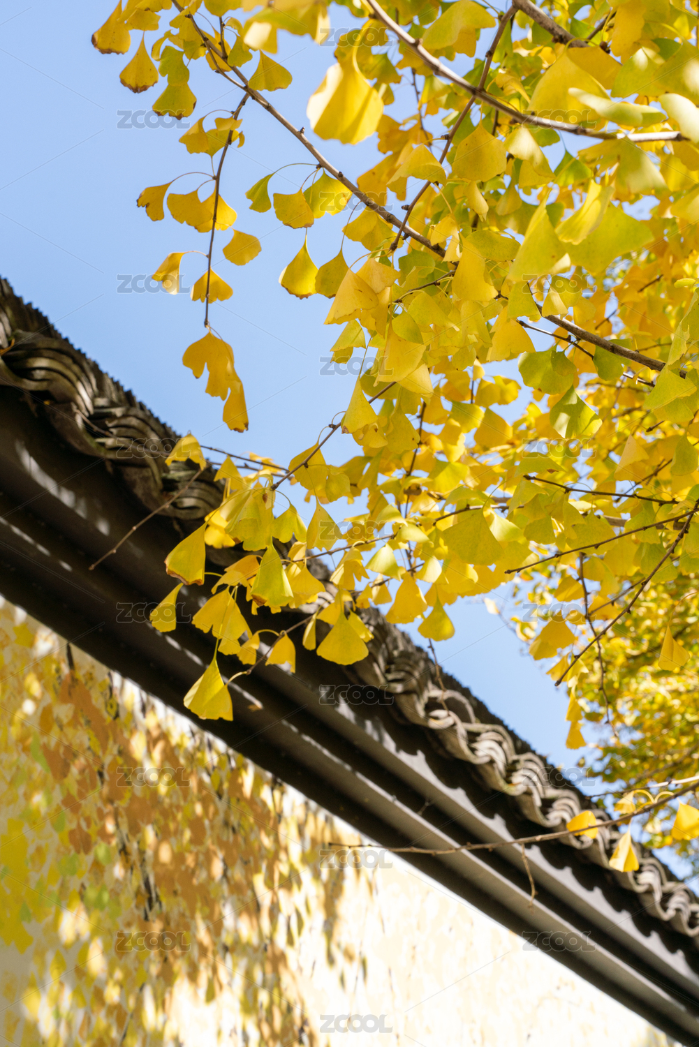 秋天季节瓦屋旁金黄色的银杏树叶子