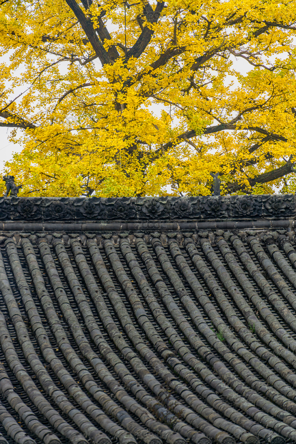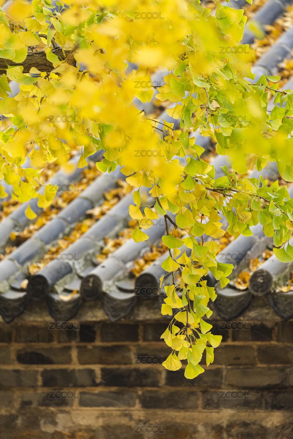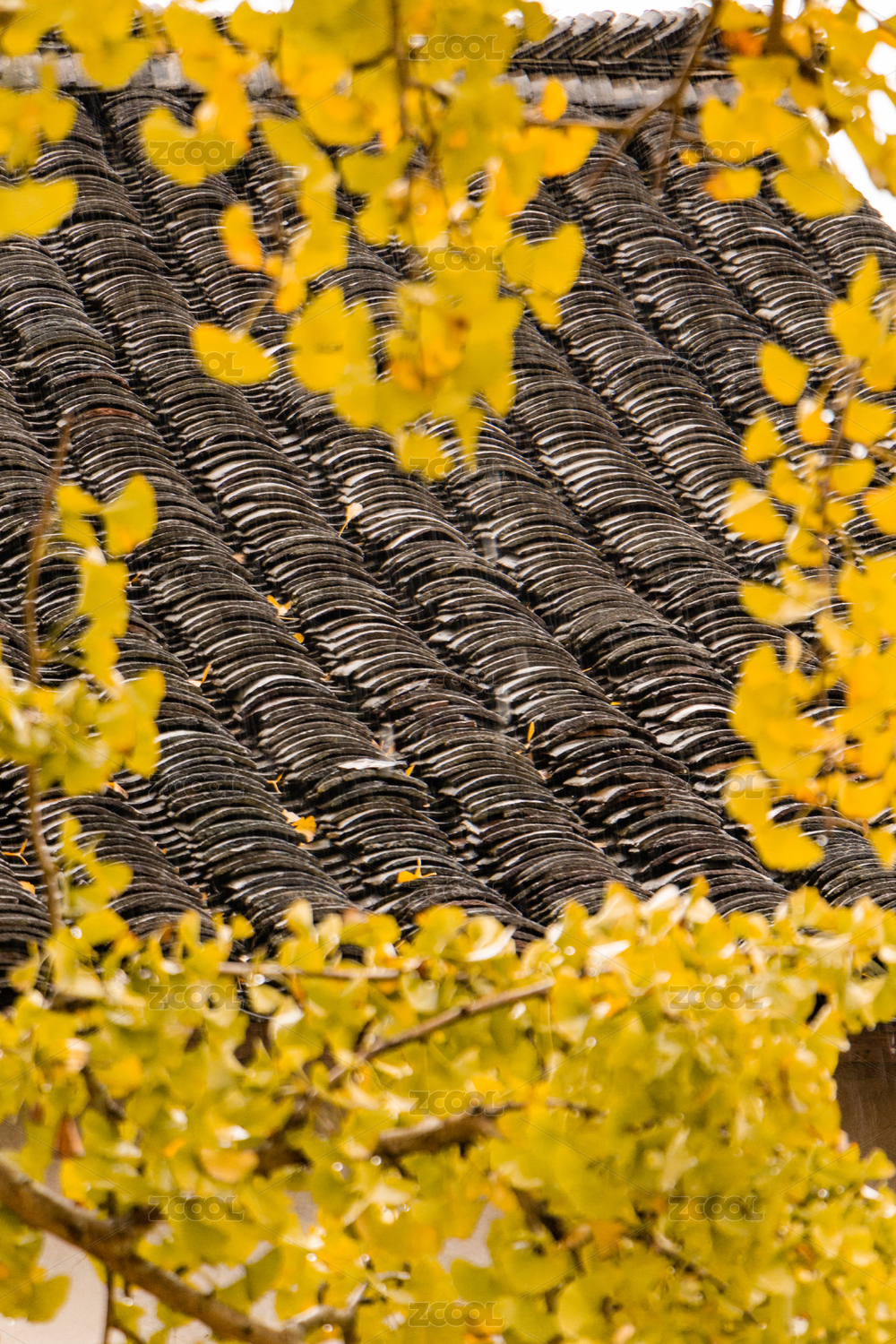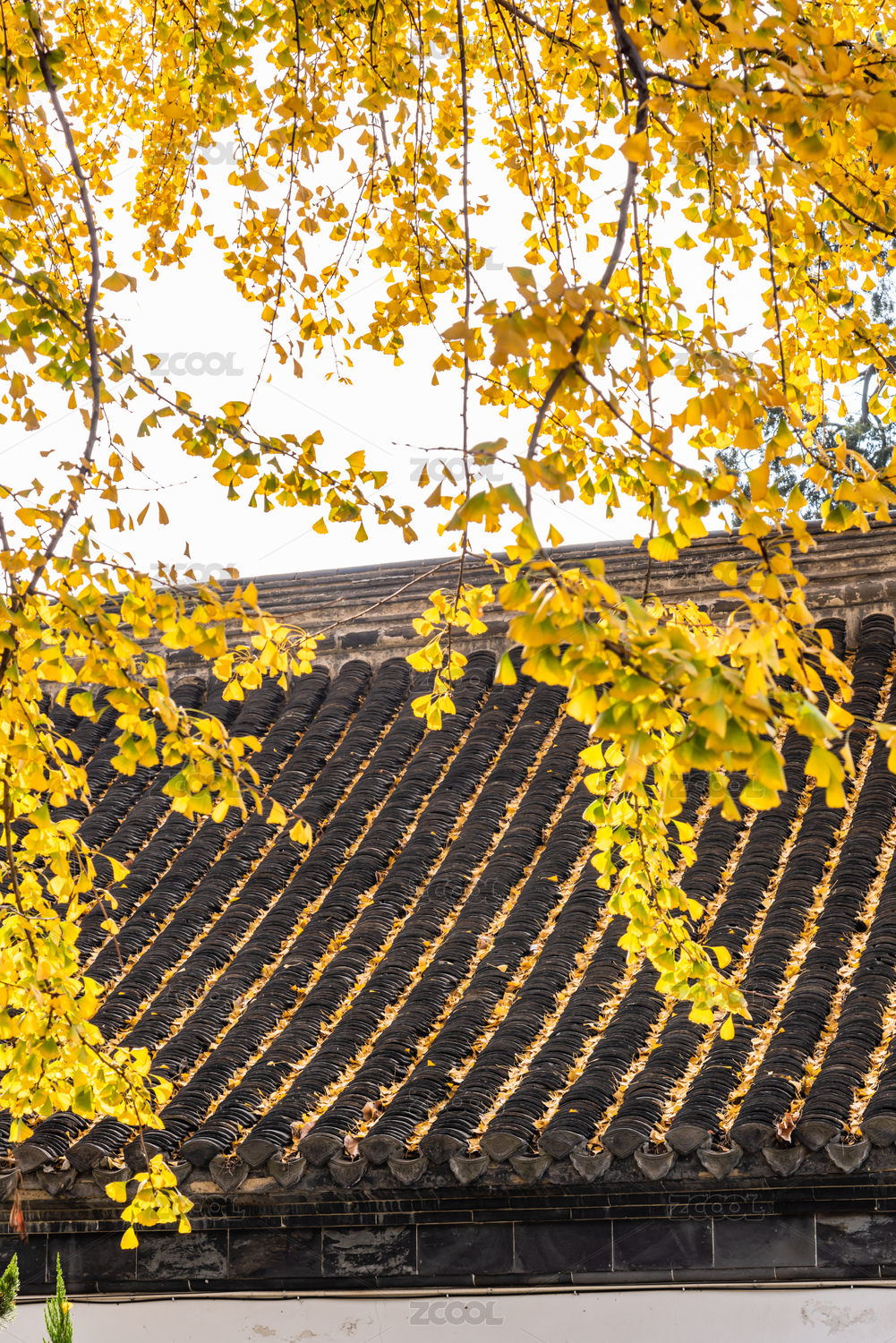 秋天季节瓦屋旁金黄色的银杏树叶子