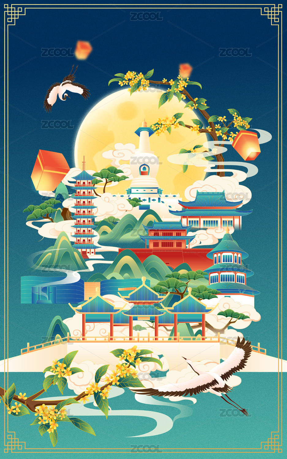 苗族头饰建筑山云雾禾花鱼手绘国风插画