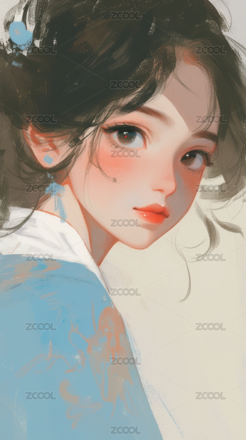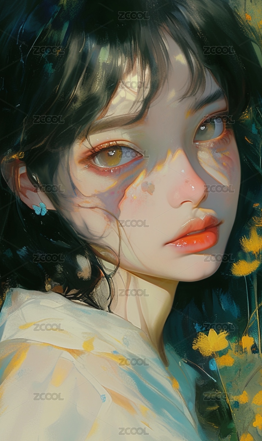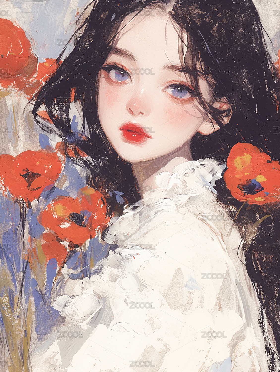 蓝色花朵下的少女红背景唯美悲伤插画油画