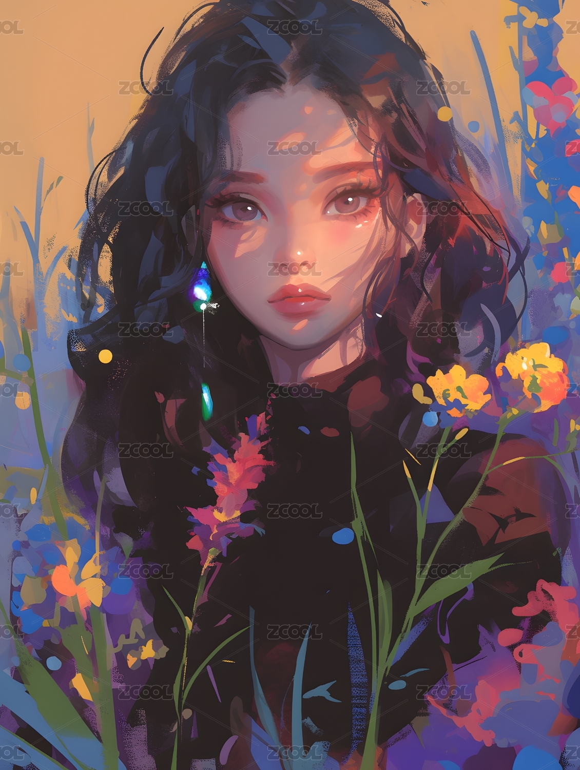 紫色长发穿紫色衣服的女孩有美丽花朵的背景
