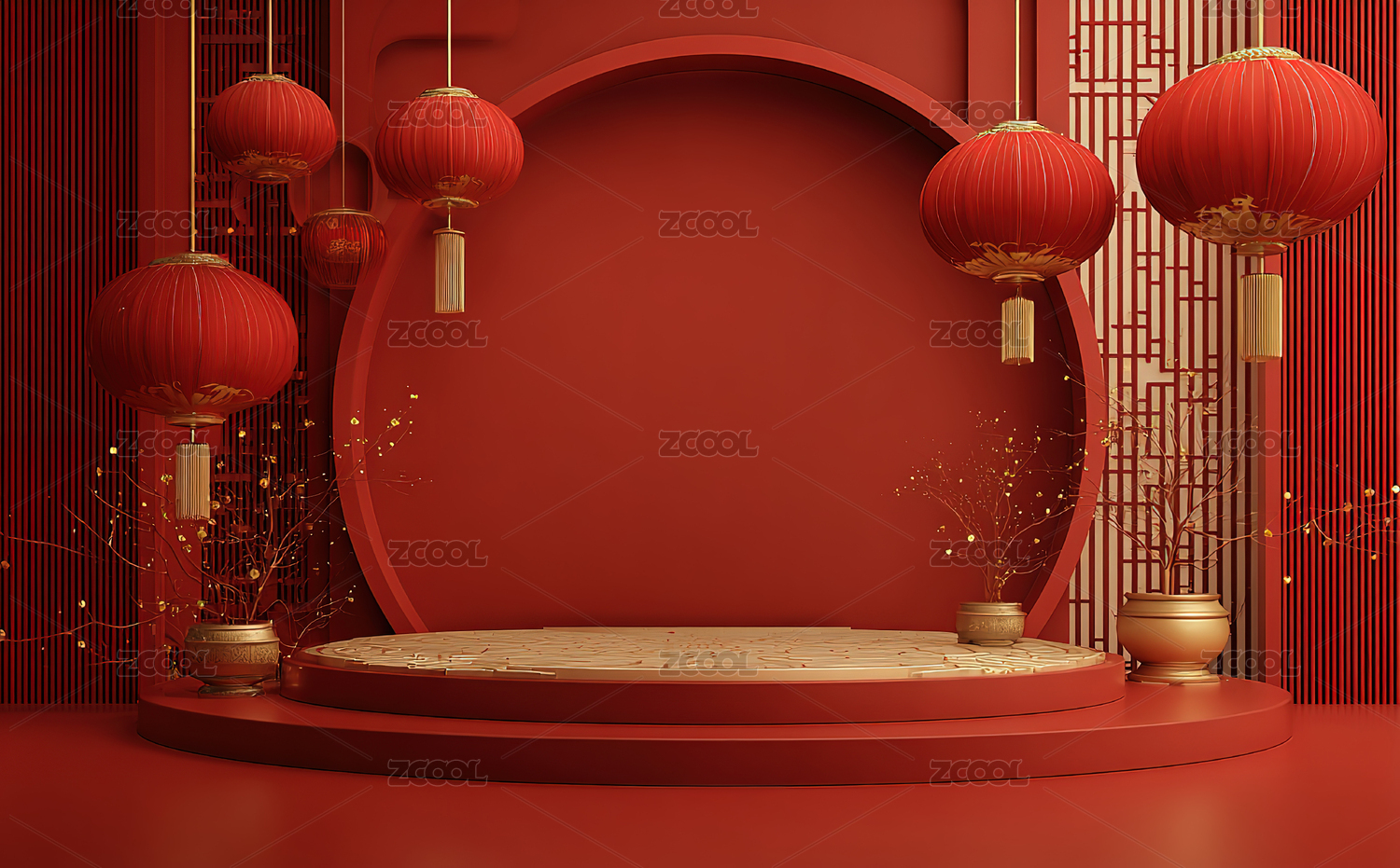 中国风红色喜庆新年灯笼花卉产品展台背景