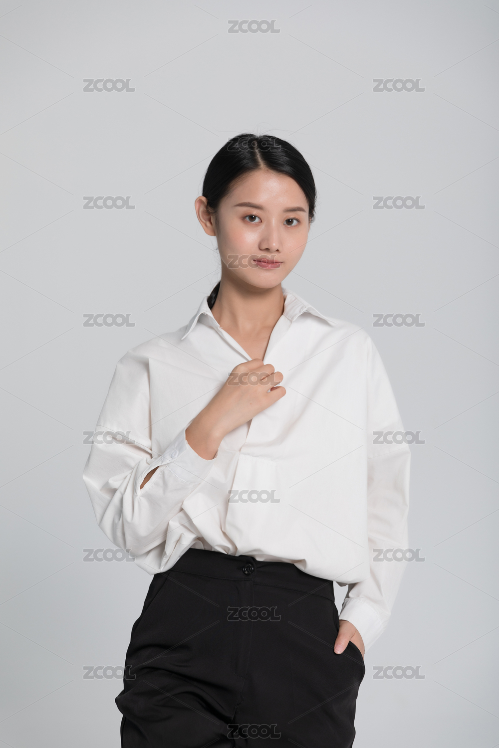 身穿白色衬衣的年轻美丽女性在抚弄自己的头发