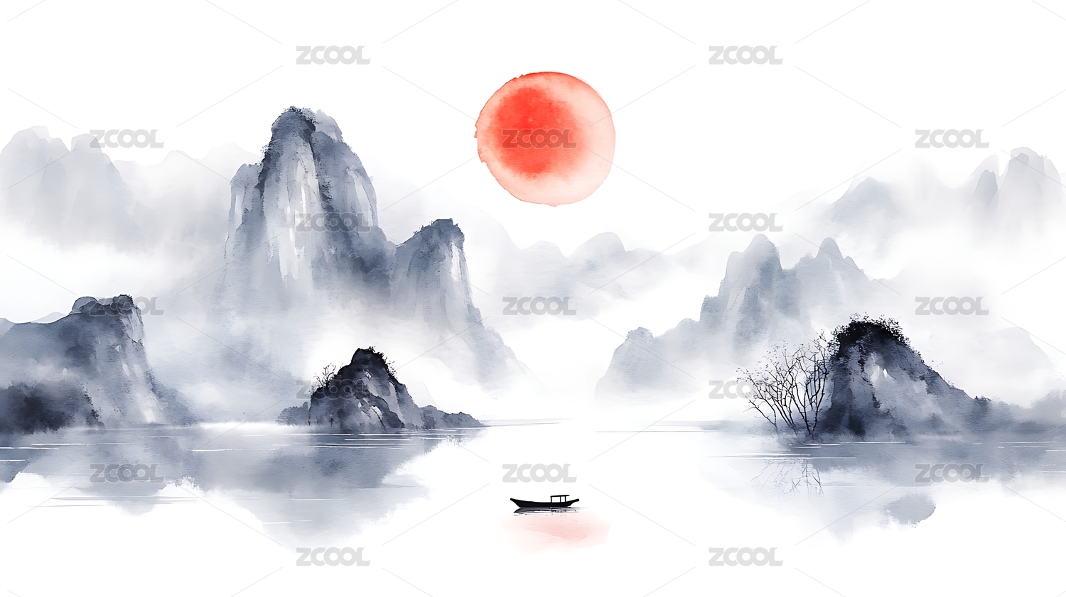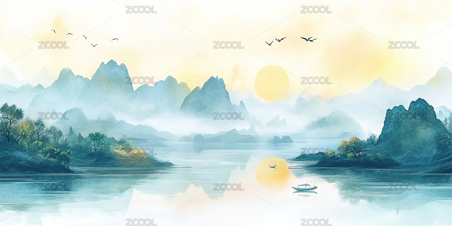 大气意境日出日落风光山水画水墨画