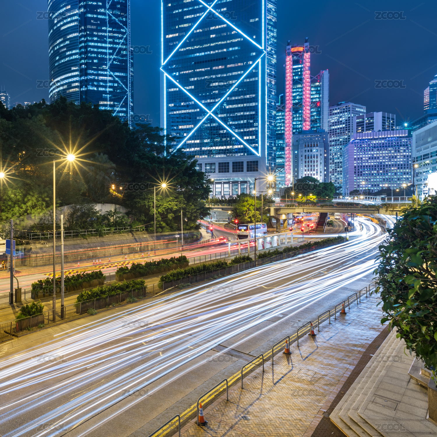 香港夜景,飞驰的汽车尾灯形成的光的轨迹