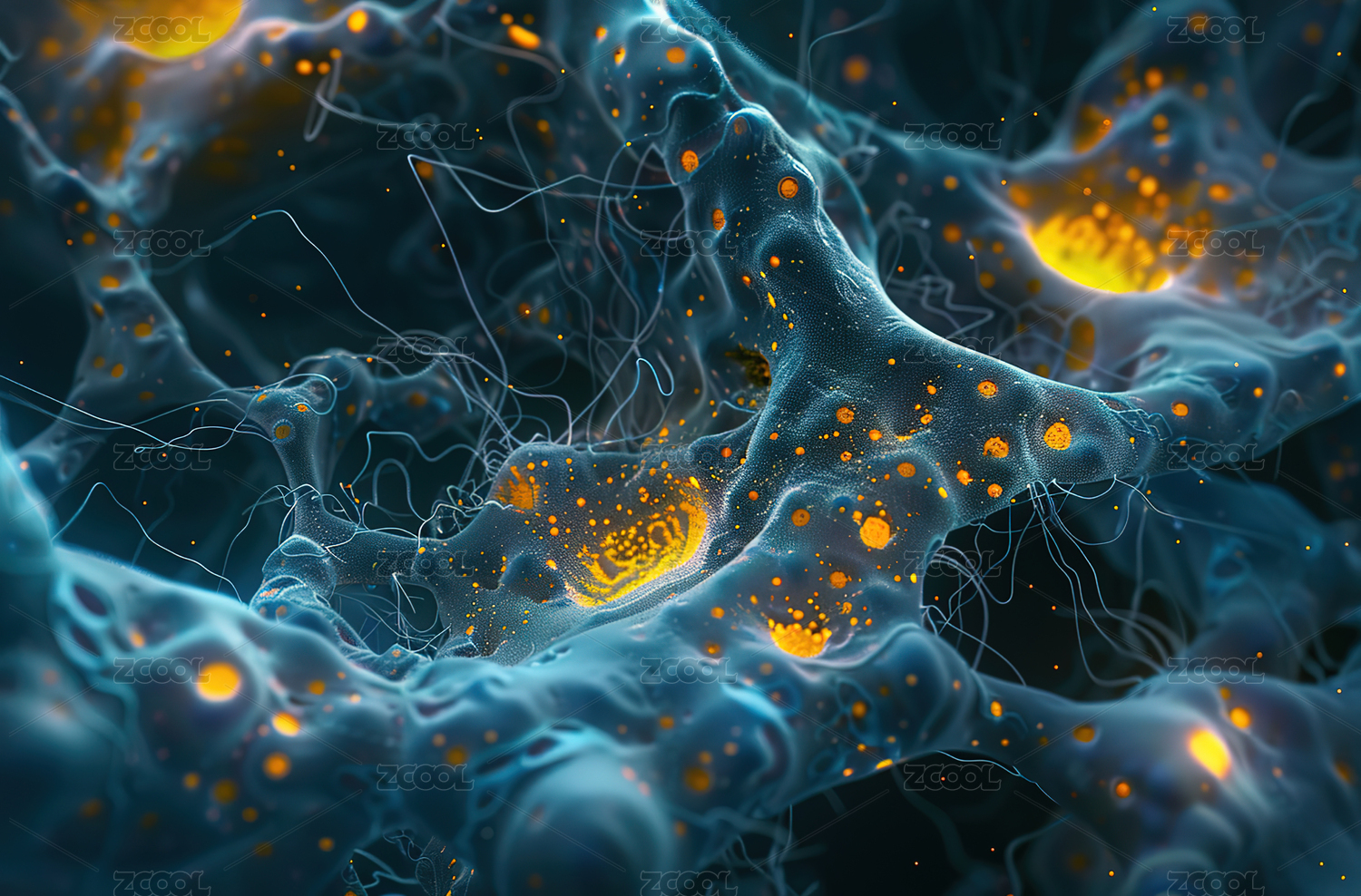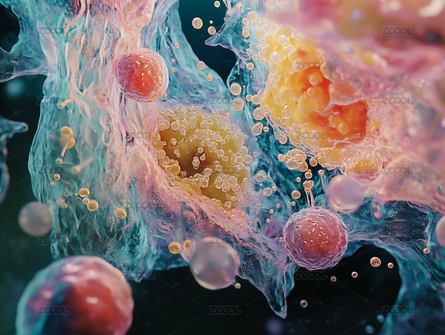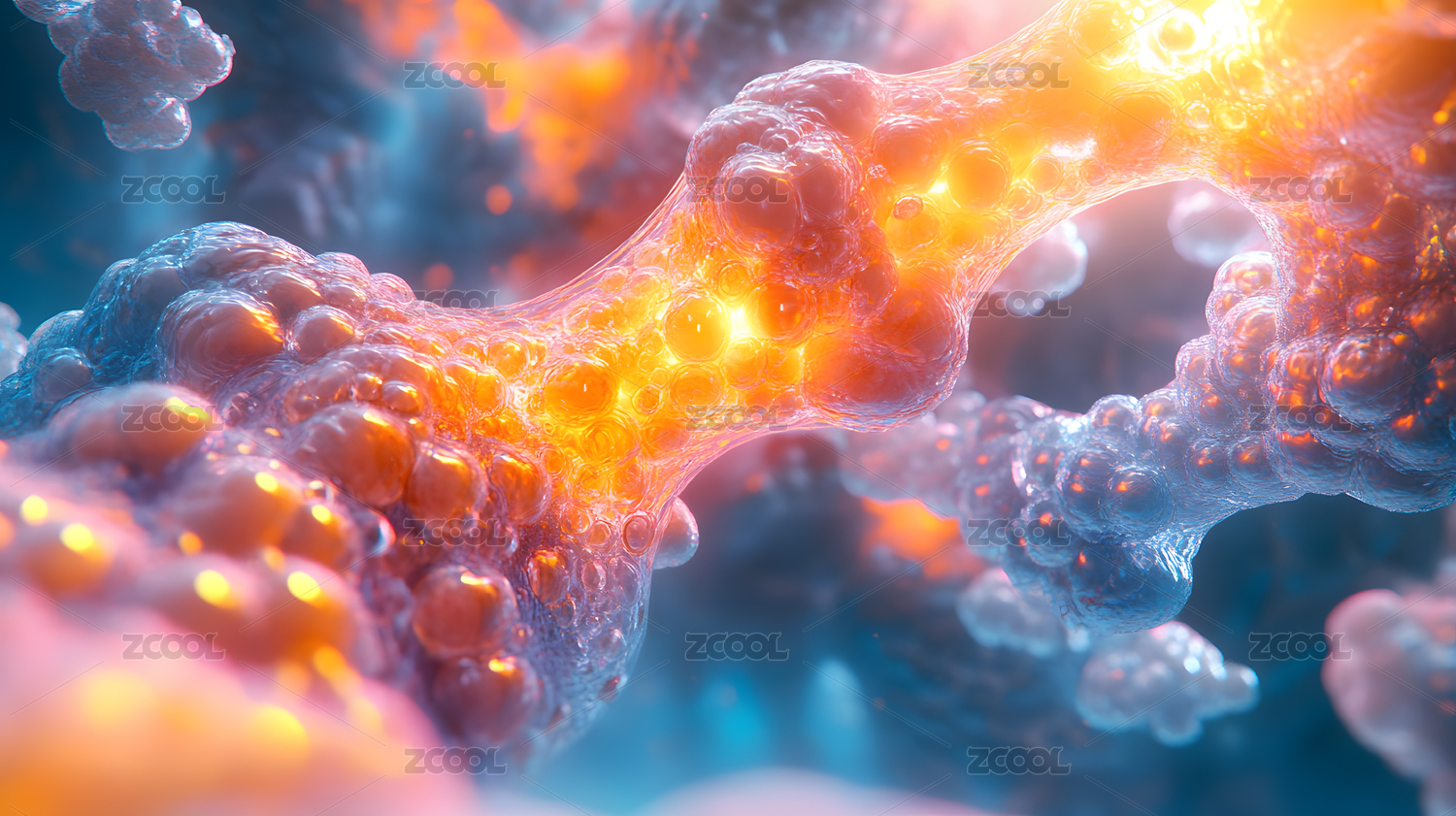 活力橙与青绿色调发光的细胞结构
