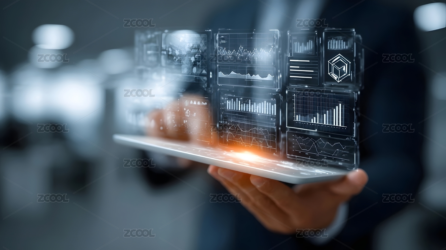 商务人士手持平板操作虚拟数据界面