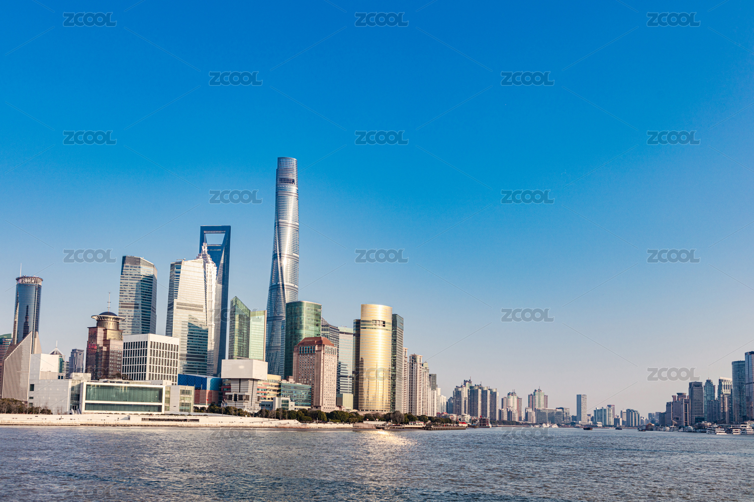 上海市中心建筑和黄浦江水面景观在晴朗夏天