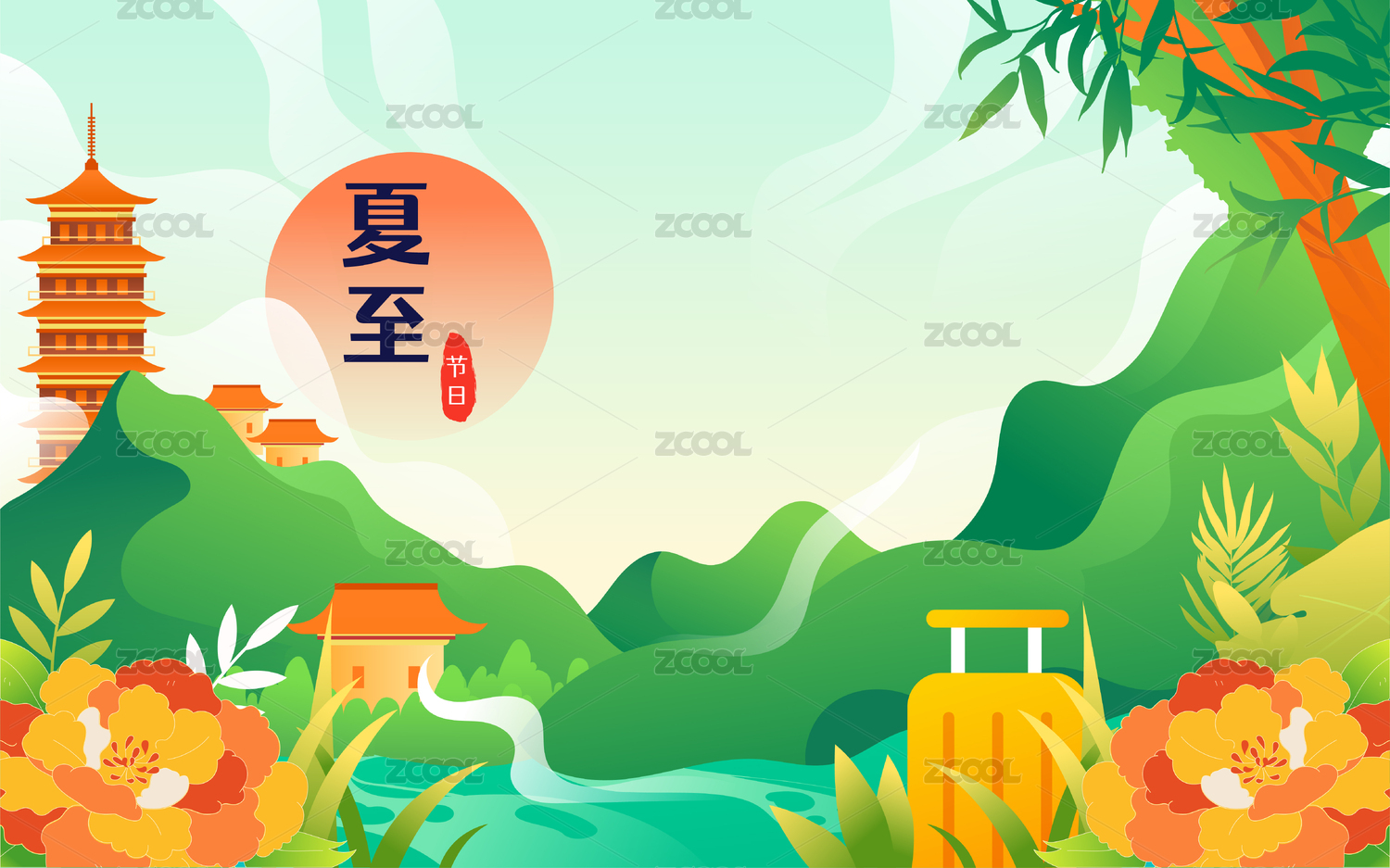 夏至节气池塘荷花人物夏天户外活动矢量插画
