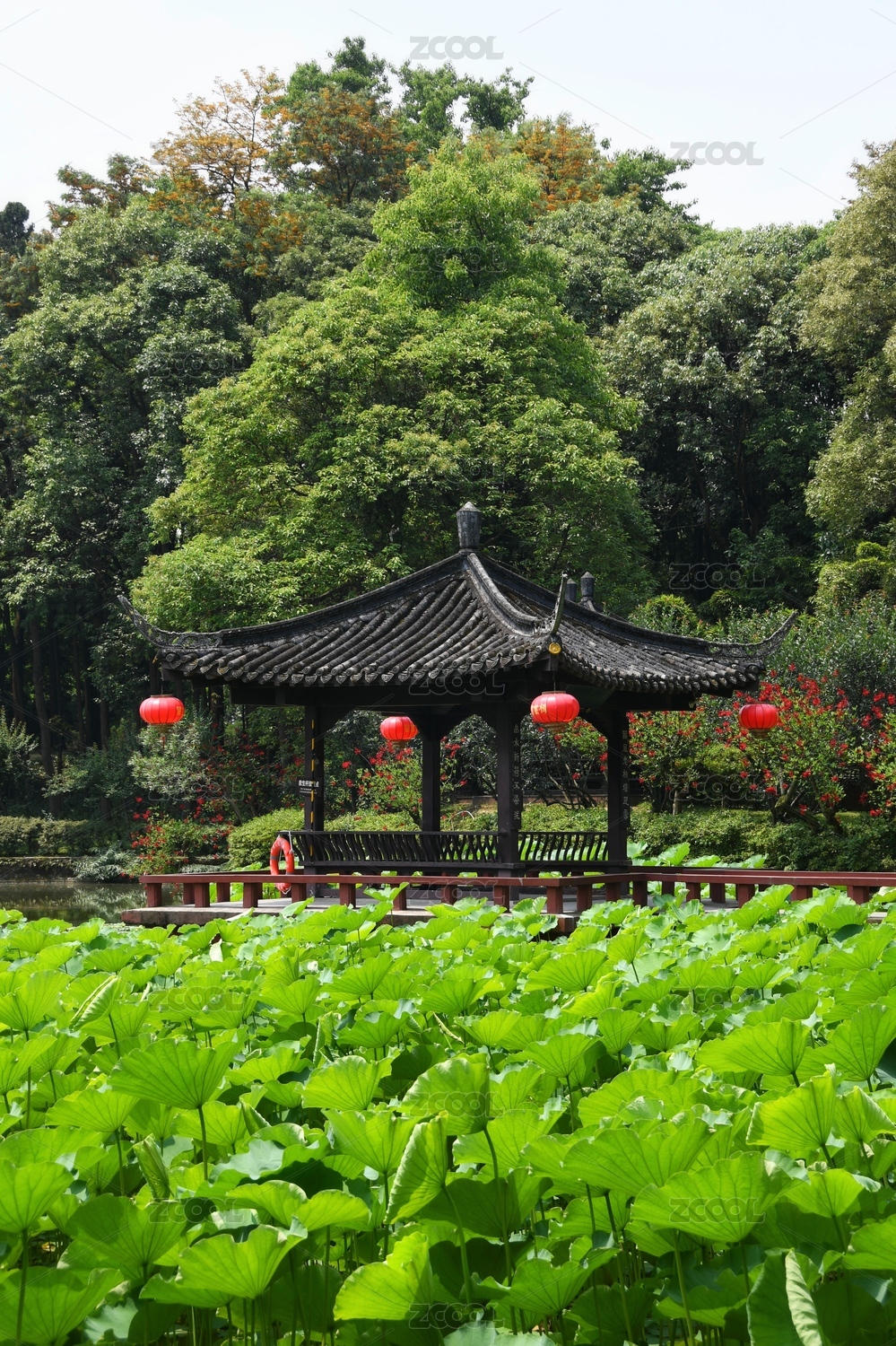 中国浙江杭州西湖景区曲院风荷,亭台楼阁