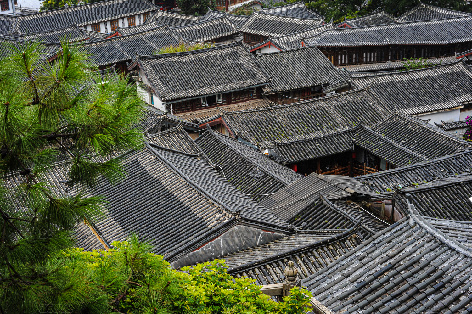 夏日丽江城的青瓦与绿意