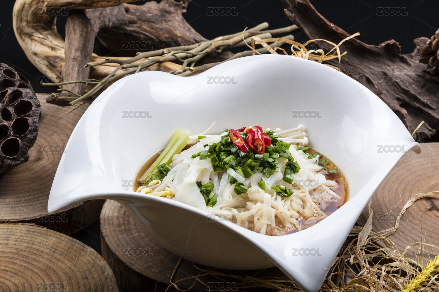 心型瓷盆装的晋味鸡汤凉皮摆放在樟木砧板上
