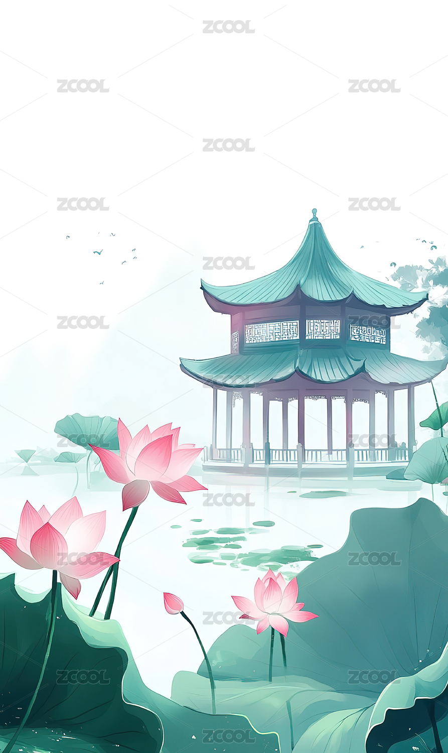 中式中国风家建筑亭台楼阁荷花池插画