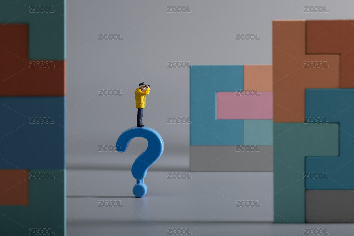 微缩创意拼图问号与思考的人
