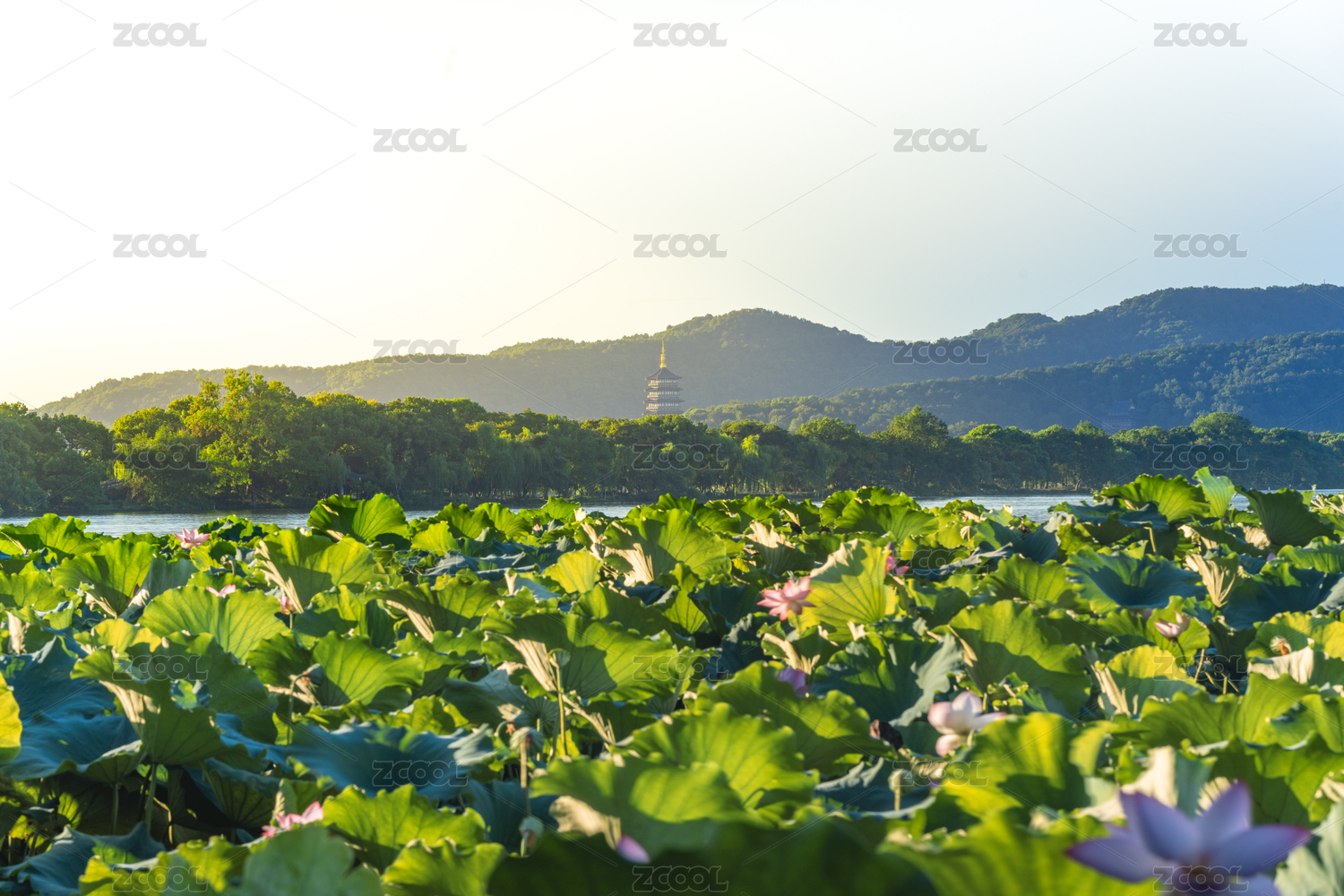 杭州夏天西湖荷花 雷峰塔与远山