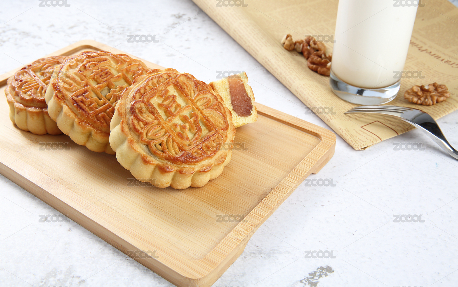 木托盘中的几块月饼和报纸牛奶叉子摆放在白色背景上