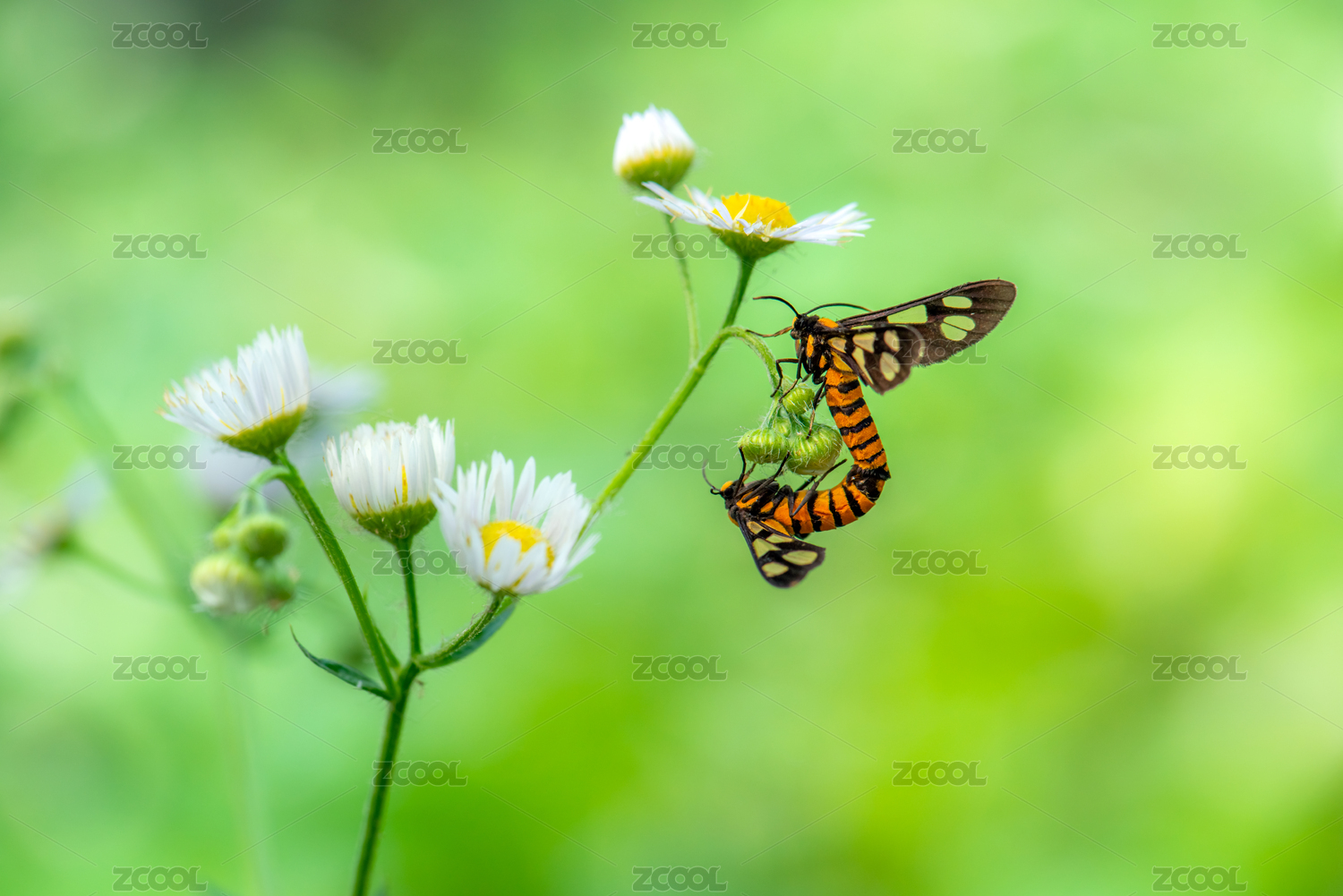 停在白色一年蓬花上交配的有橙色花纹的鹿蛾